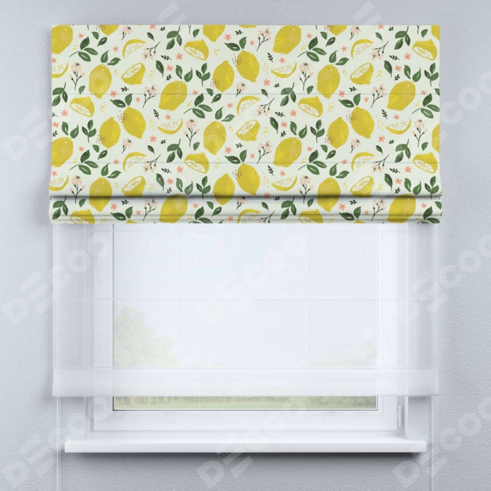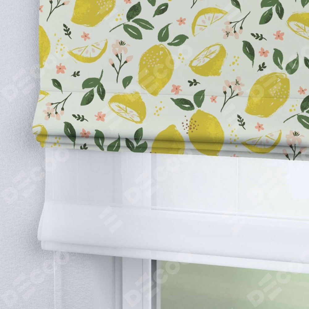 Римская штора день-ночь производителя «Cortin», используется для проёма, пошита из двух полотен, с лицевой блэкаут с нанесением сублимационной печати «Сочные лимоны», вторая ткань тюль (по стандарту комплектуется тюль белого цвета артикул V-01). Имеет универсальный механизм и подходит для монтажа: на потолок, на стену и в нишу.