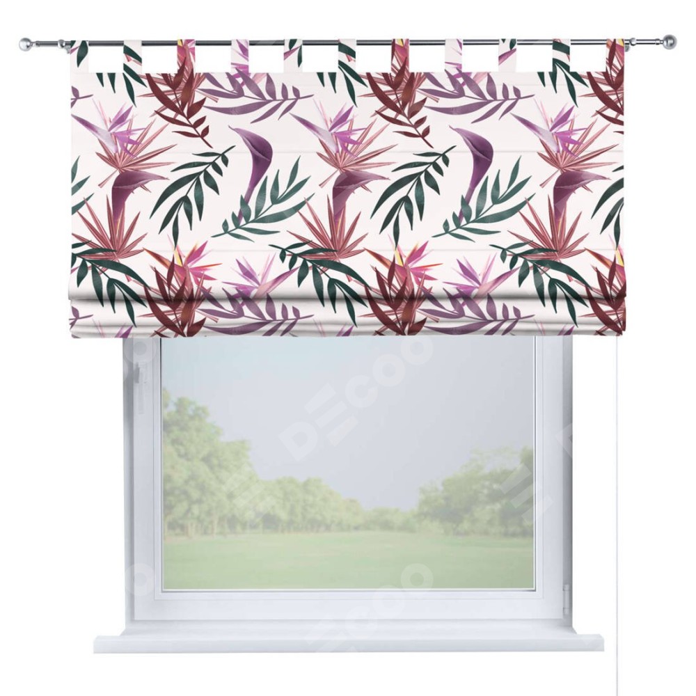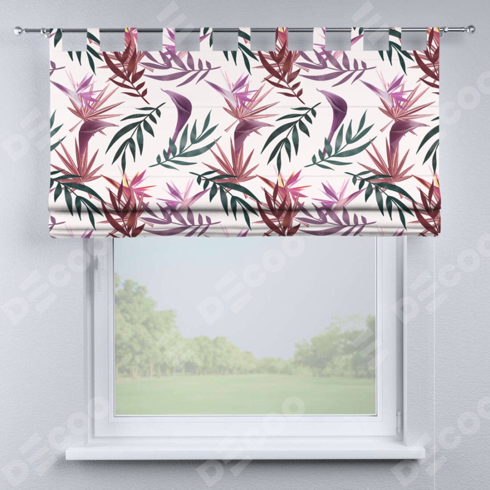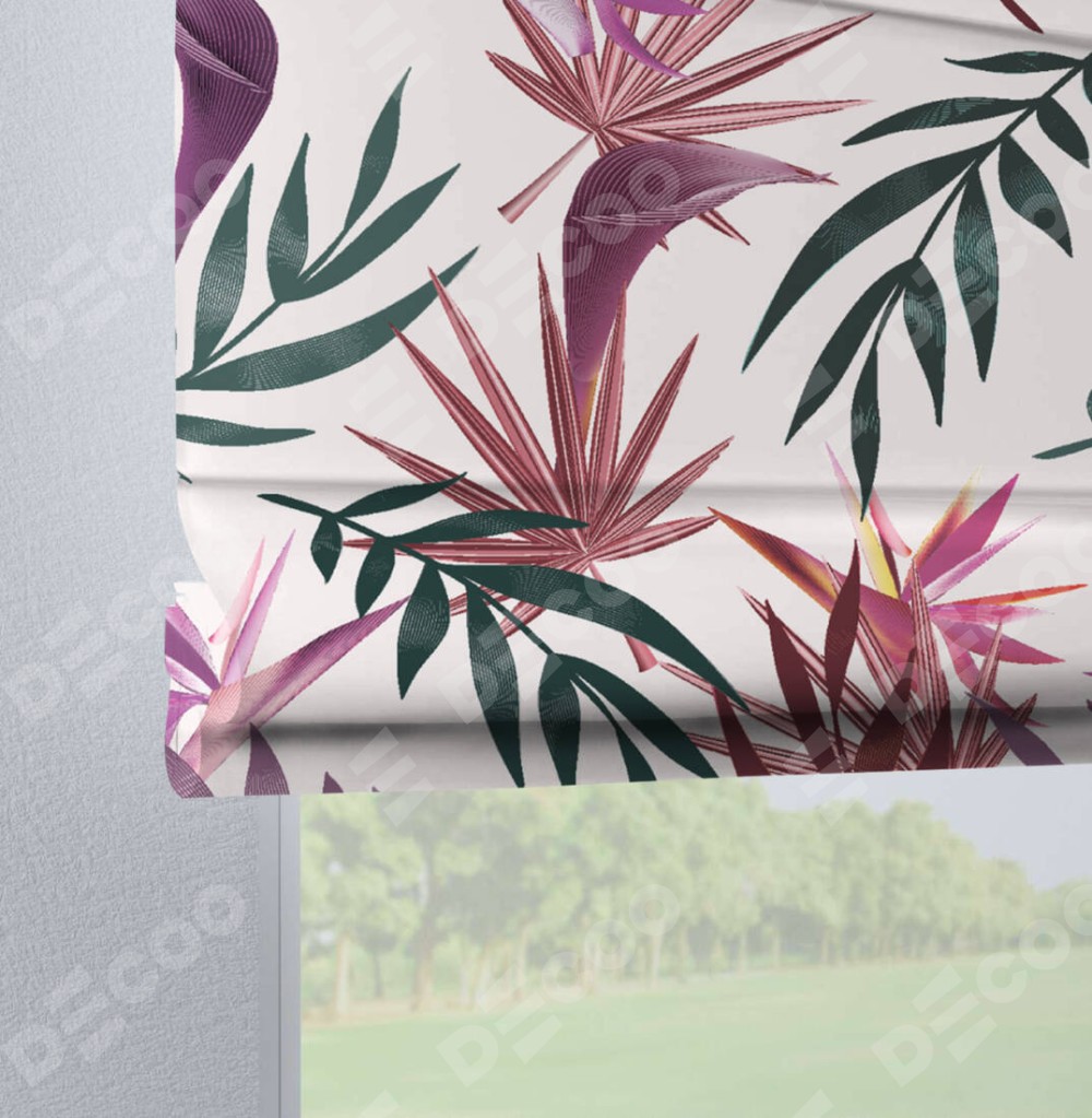 Римская штора производителя «Cortin», используется для проёма, пошита из ткани блэкаут с нанесением сублимационной печати «Тропические побеги». Данная модель пошита на петлях, комплектуется на выбор круглым карнизом и подходит для монтажа на стену. Римская штора на петлях имеет простую систему регулировки высоты, отличительным преимуществом данной модели является простой способ монтажа. Достаточно повесить ее на трубу и штора готова!