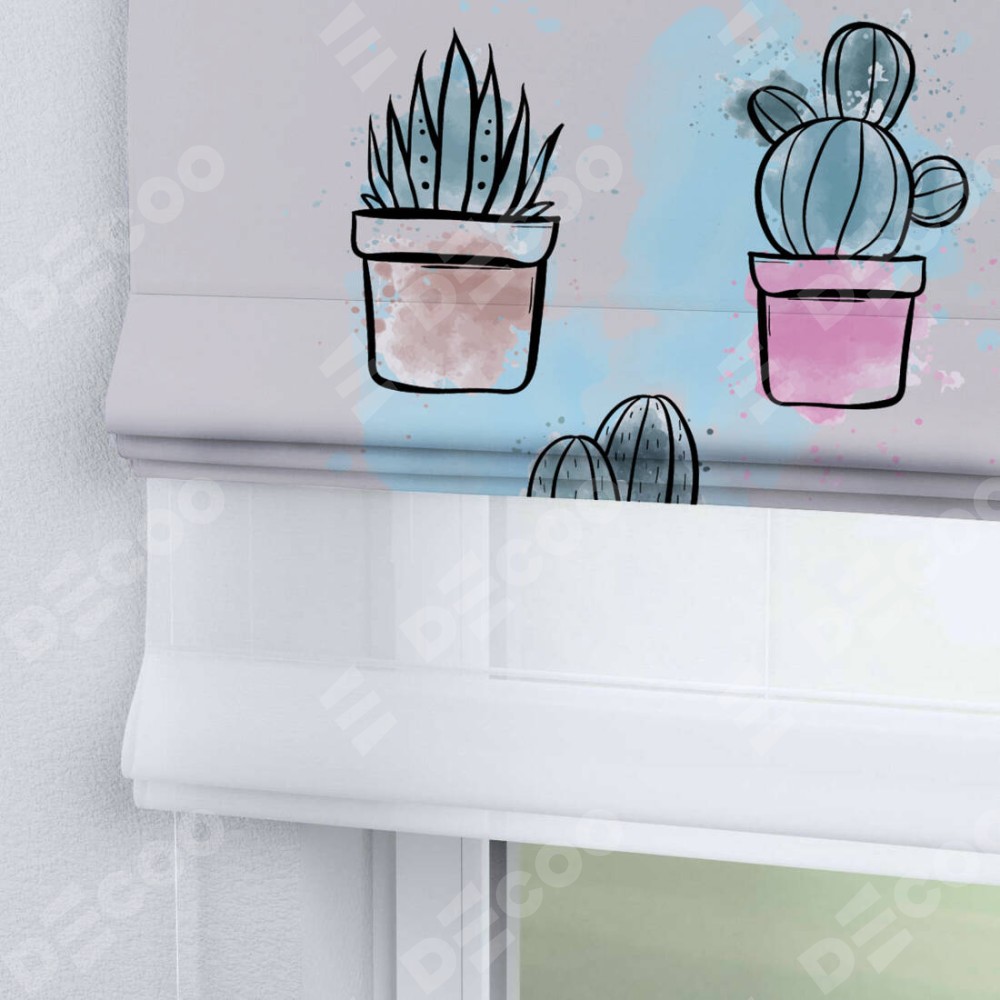 Римская штора день-ночь производителя «Cortin», используется для проёма, пошита из двух полотен, с лицевой блэкаут с нанесением сублимационной печати «Кактусовая оранжерея», вторая ткань тюль (по стандарту комплектуется тюль белого цвета артикул V-01). Имеет универсальный механизм и подходит для монтажа: на потолок, на стену и в нишу.
