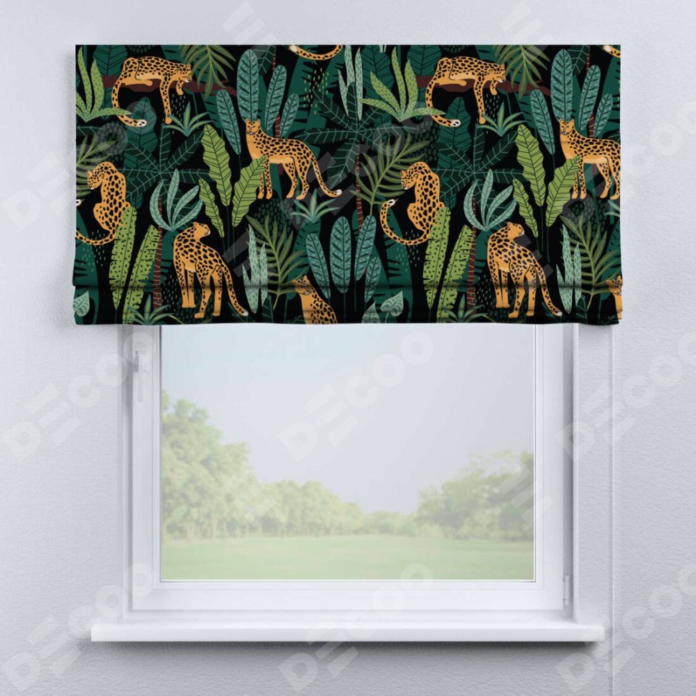 Римская штора производителя «Cortin», используется для проёма, пошита из ткани блэкаут с нанесением сублимационной печати «Леопарды в джунглях». Имеет универсальный механизм и подходит для монтажа: на потолок, на стену и в нишу.