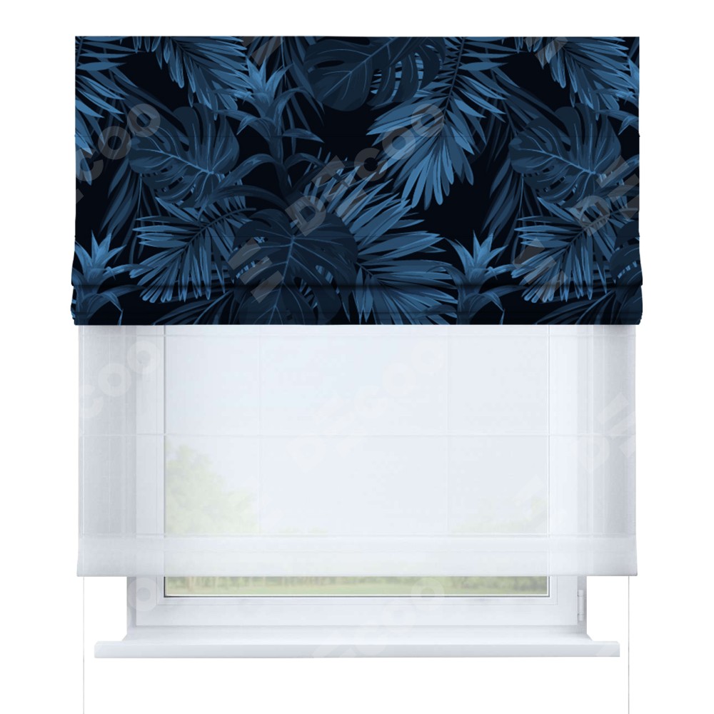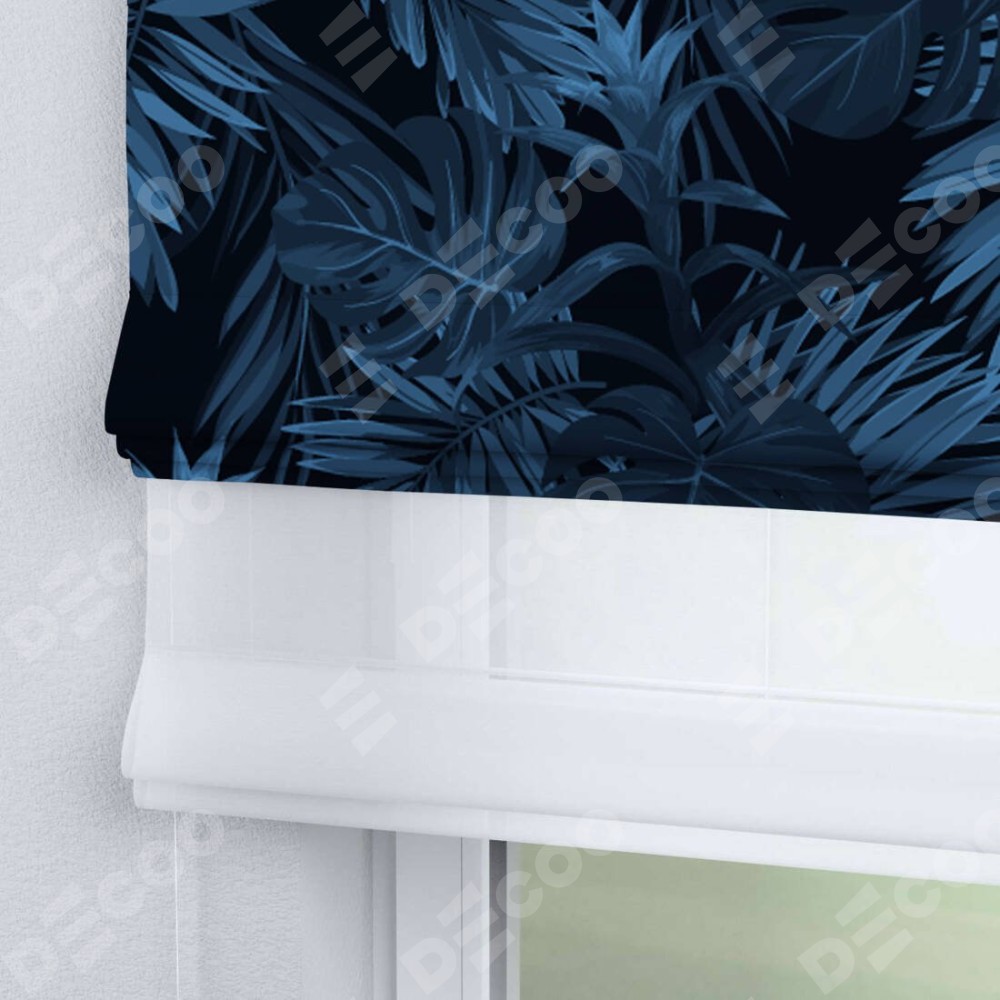 Римская штора день-ночь производителя «Cortin», используется для проёма, пошита из двух полотен, с лицевой блэкаут с нанесением сублимационной печати «Ночные джунгли», вторая ткань тюль (по стандарту комплектуется тюль белого цвета артикул V-01). Имеет универсальный механизм и подходит для монтажа: на потолок, на стену и в нишу.