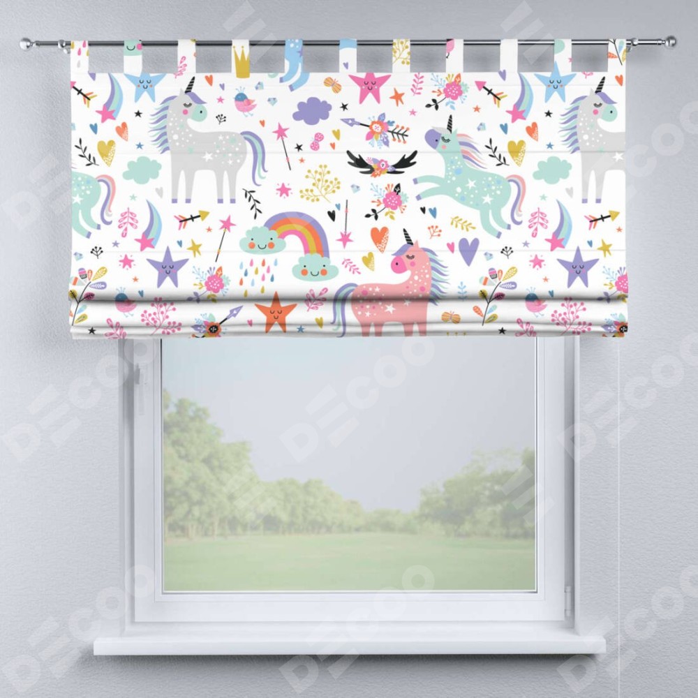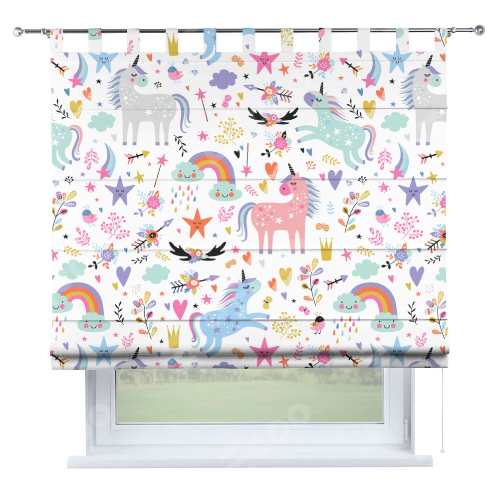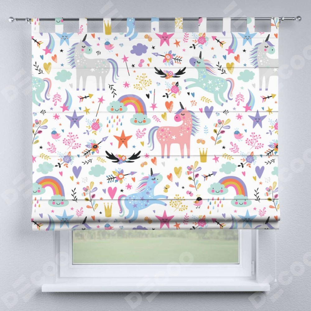 Римская штора производителя «Cortin», используется для проёма, пошита из ткани блэкаут с нанесением сублимационной печати «Радужные единороги». Данная модель пошита на петлях, комплектуется на выбор круглым карнизом и подходит для монтажа на стену. Римская штора на петлях имеет простую систему регулировки высоты, отличительным преимуществом данной модели является простой способ монтажа. Достаточно повесить ее на трубу и штора готова!