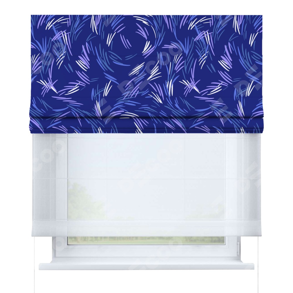 Римская штора день-ночь производителя «Cortin», используется для проёма, пошита из двух полотен, с лицевой блэкаут с нанесением сублимационной печати «Синяя абстракция», вторая ткань тюль (по стандарту комплектуется тюль белого цвета артикул V-01). Имеет универсальный механизм и подходит для монтажа: на потолок, на стену и в нишу.