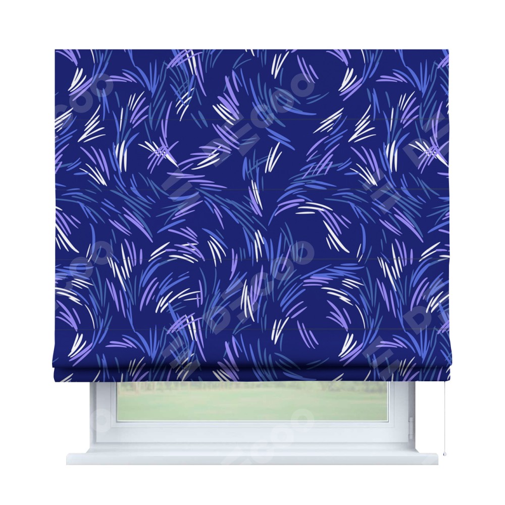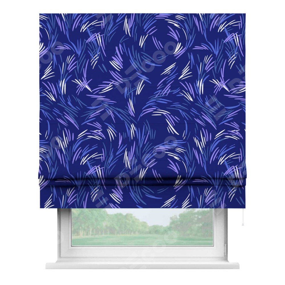 Римская штора производителя «Cortin», используется для проёма, пошита из ткани блэкаут с нанесением сублимационной печати «Синяя абстракция». Имеет универсальный механизм и подходит для монтажа: на потолок, на стену и в нишу.