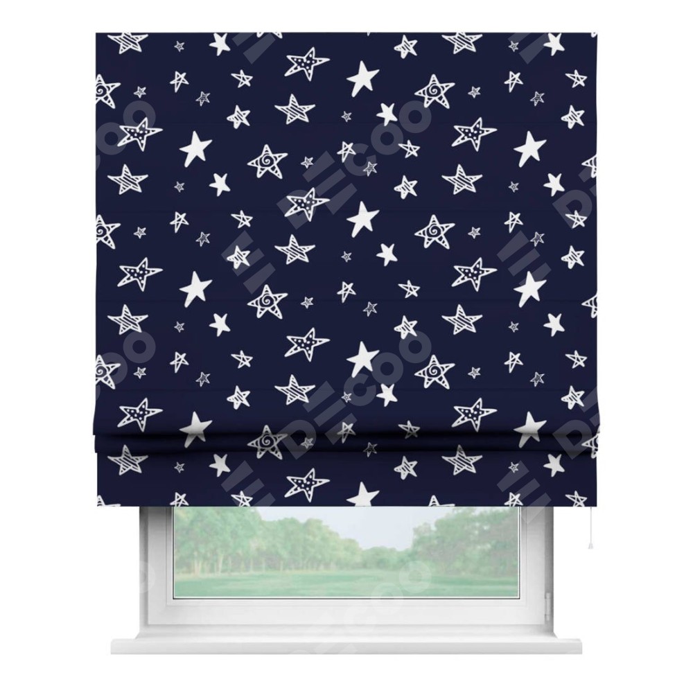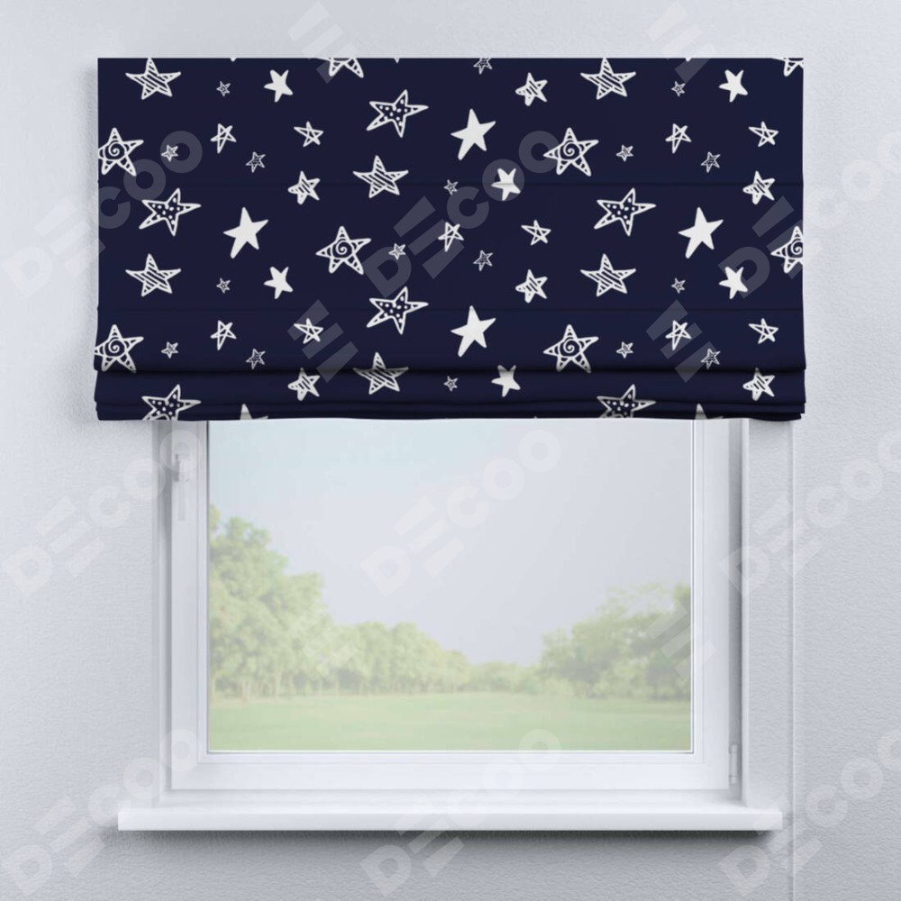 Римская штора производителя «Cortin», используется для проёма, пошита из ткани блэкаут с нанесением сублимационной печати «Ночные звёзды». Имеет универсальный механизм и подходит для монтажа: на потолок, на стену и в нишу.