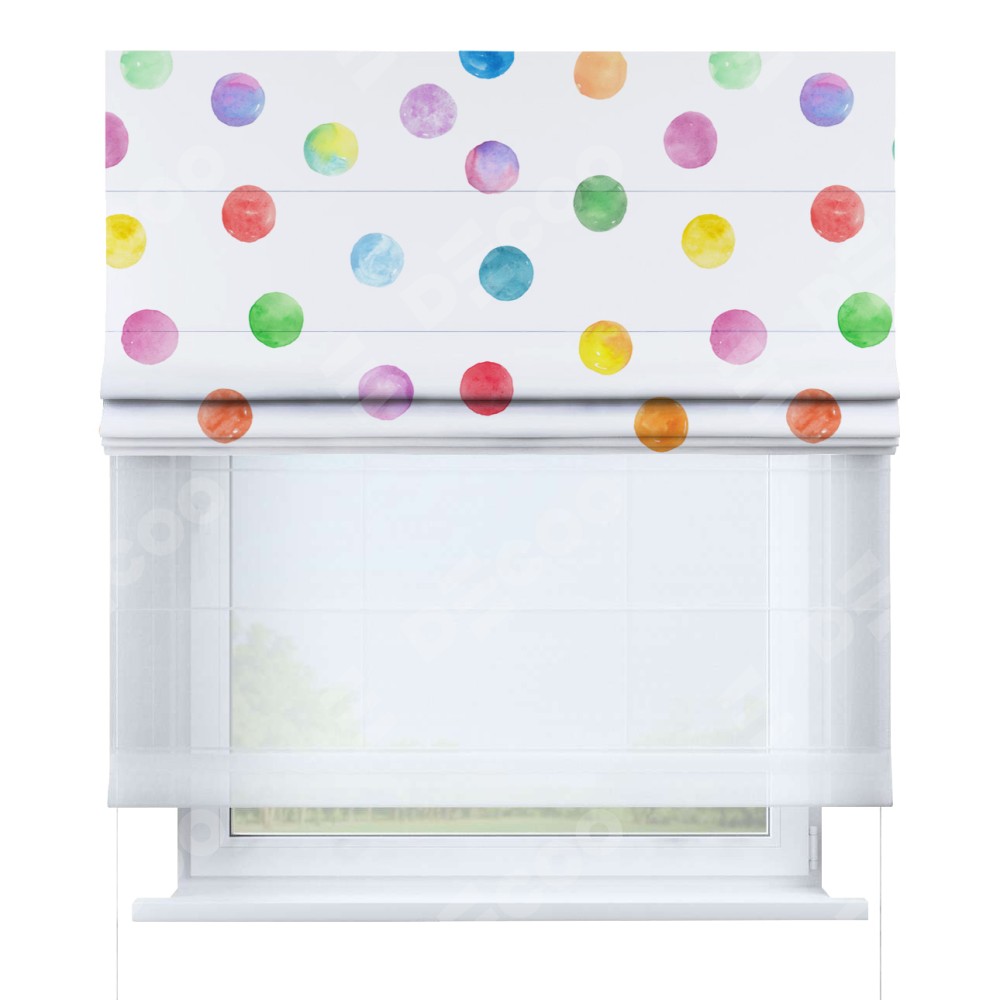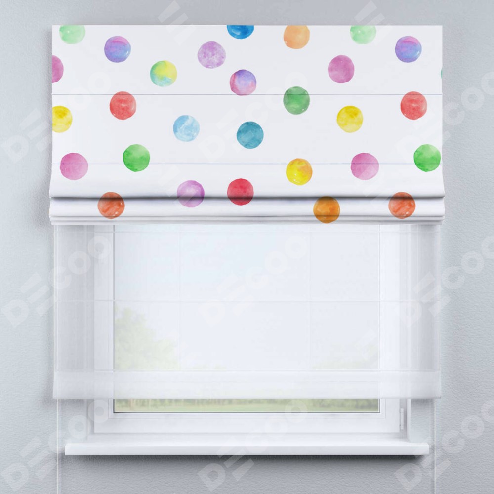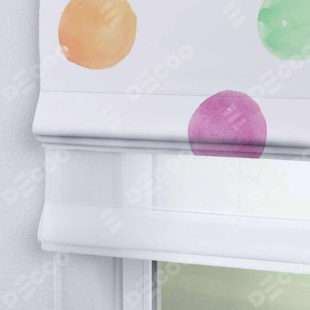 Римская штора день-ночь производителя «Cortin», используется для проёма, пошита из двух полотен, с лицевой блэкаут с нанесением сублимационной печати «Цветные круги», вторая ткань тюль (по стандарту комплектуется тюль белого цвета артикул V-01). Имеет универсальный механизм и подходит для монтажа: на потолок, на стену и в нишу.