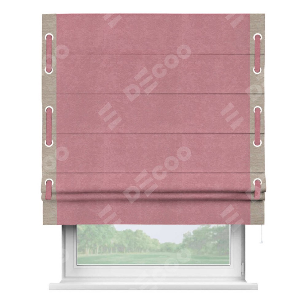 Римская штора производителя «Cortin», используется для проёма, пошита из ткани софт однотонный розовый, артикул 42926. Отделка шторы кантом «Стрим Дуо» на кантах расположены люверсы с пояском, ткань для канта используется из софта разной расцветки на выбор. Ткань для пояска обычно используется из основной ткани шторы, а так же можно сделать из любой расцветки по желанию. Имеет универсальный механизм и подходит для монтажа: на потолок, на стену и в нишу.