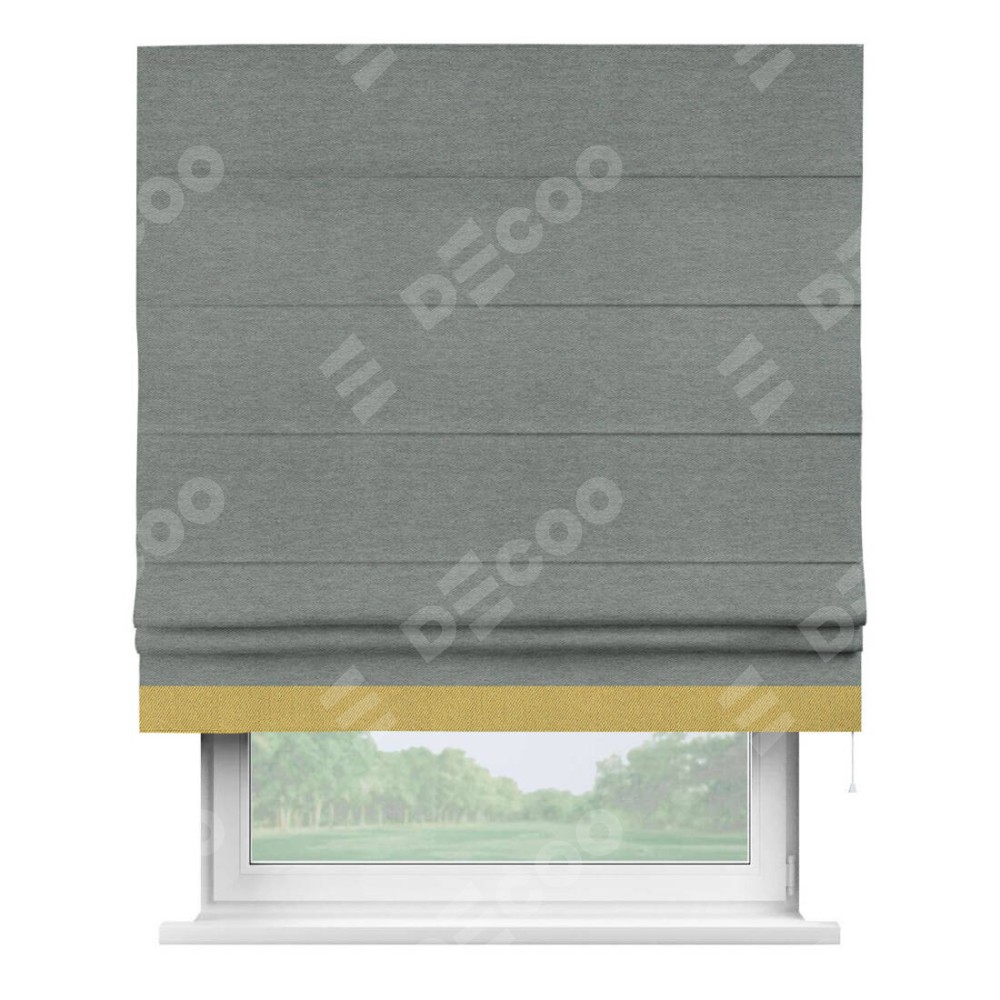 Римская штора производителя «Cortin», используется для проёма, пошита из ткани твид блэкаут серый, артикул 21577. Отделка шторы кантом «Джестер», ткань для канта используется из твида разной расцветки на выбор. Имеет универсальный механизм и подходит для монтажа: на потолок, на стену и в нишу.