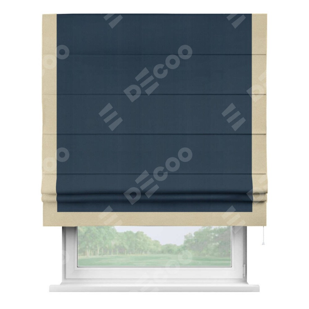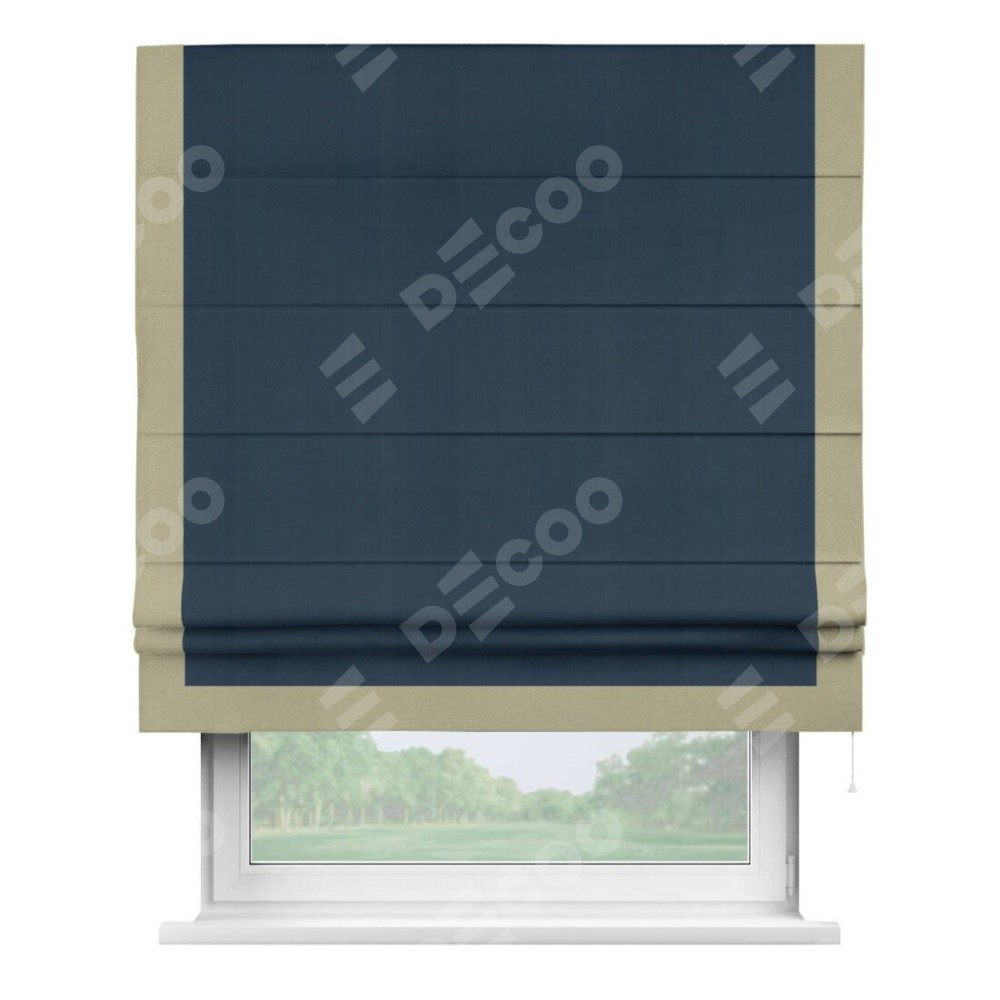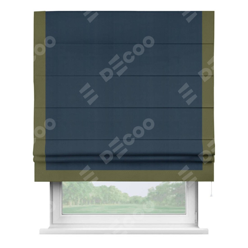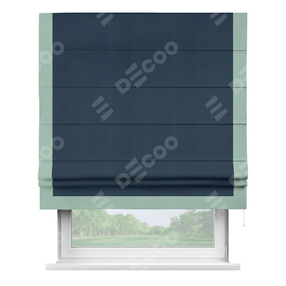 Римская штора производителя «Cortin», используется для проёма, пошита из ткани блэкаут однотонный синий, артикул ткани 29327. Отделка шторы кантом «Виктория», ткань для канта используется из блэкаута однотонного разной расцветки на выбор. Имеет универсальный механизм и подходит для монтажа: на потолок, на стену и в нишу.