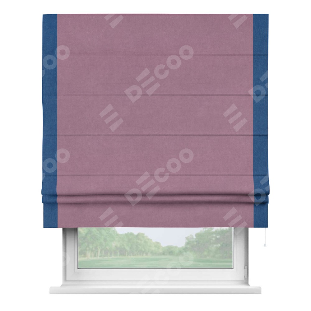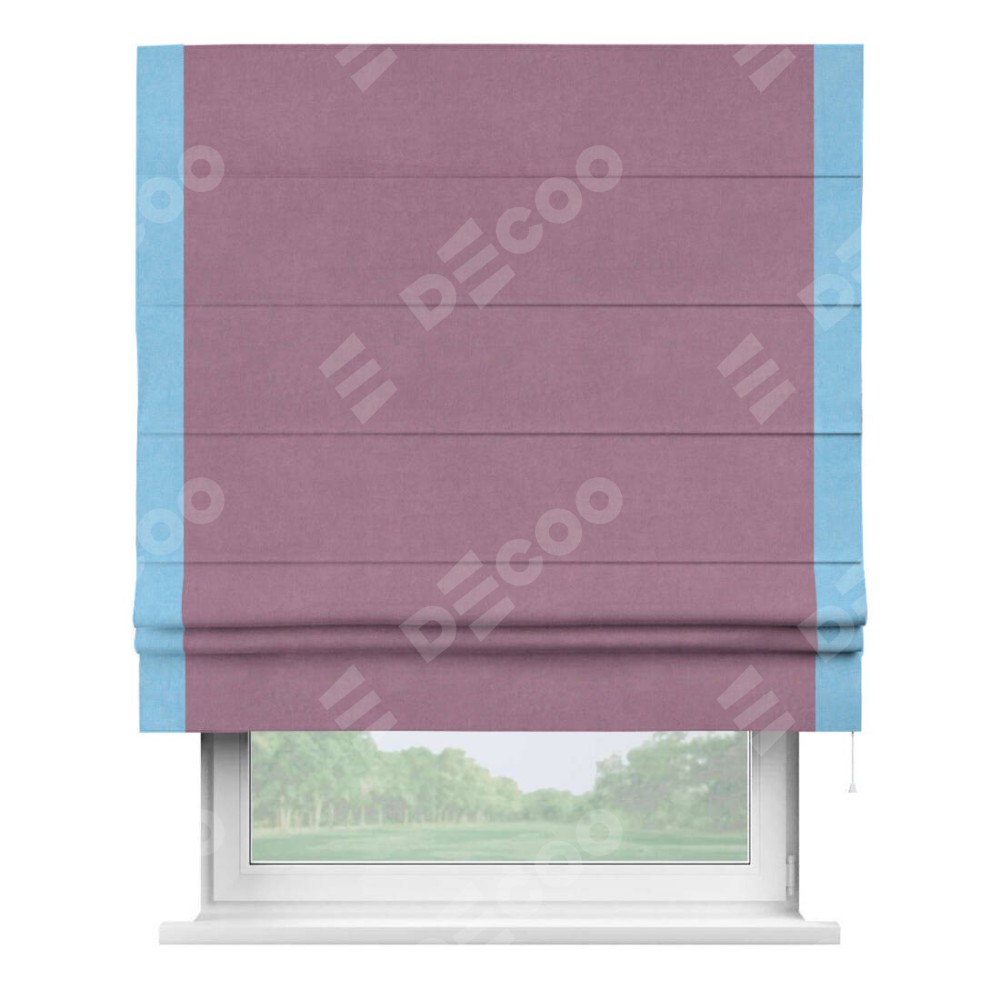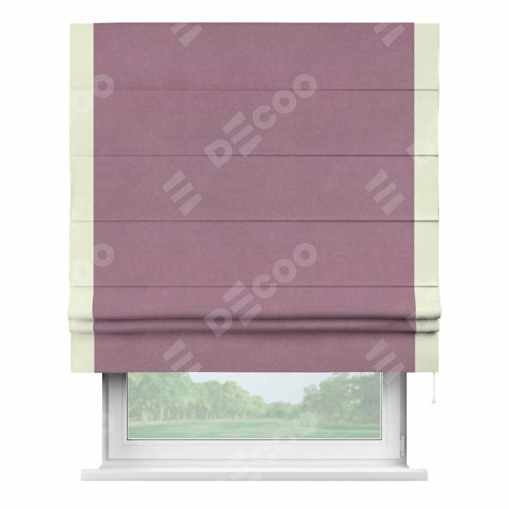 Римская штора производителя «Cortin», используется для проёма, пошита из ткани вельвет лиловый, артикул ткани 17752. Отделка шторы кантом «Стрим Дуо», ткань для канта используется из вельвета разной расцветки на выбор. Имеет универсальный механизм и подходит для монтажа: на потолок, на стену и в нишу.