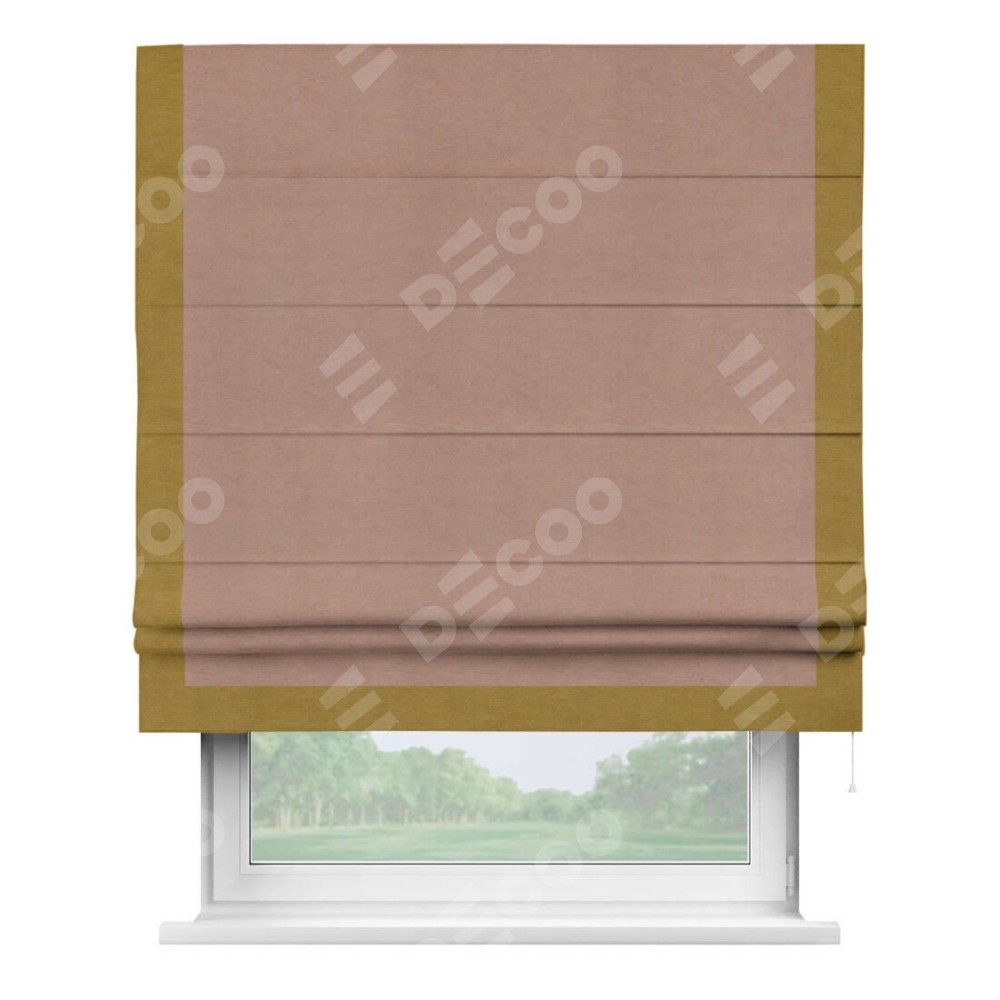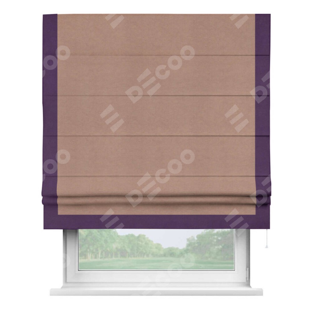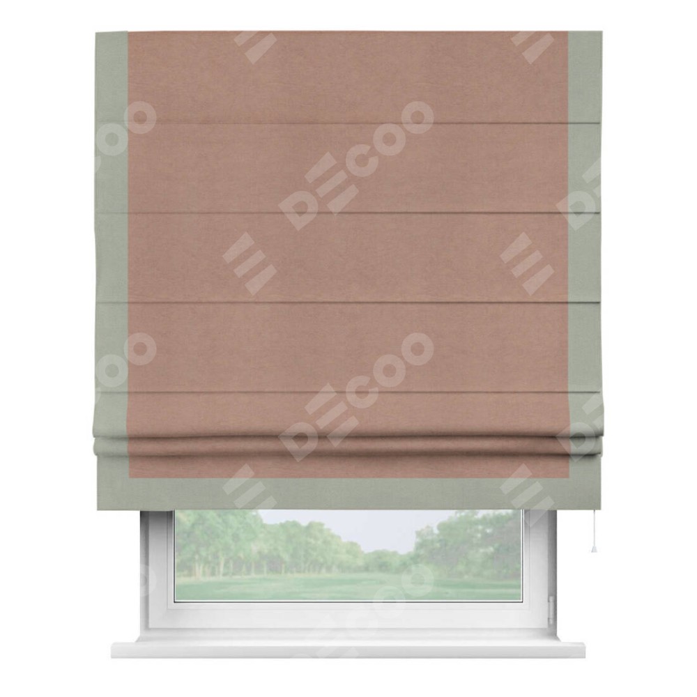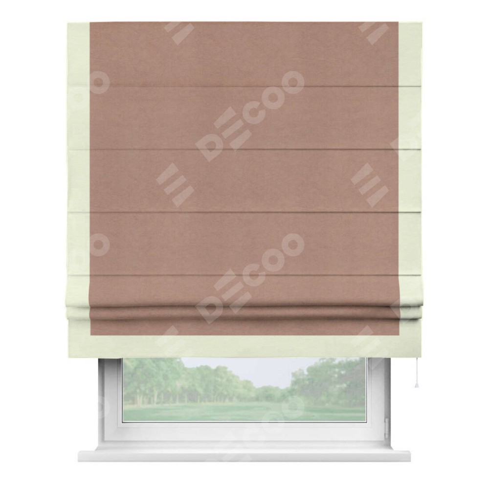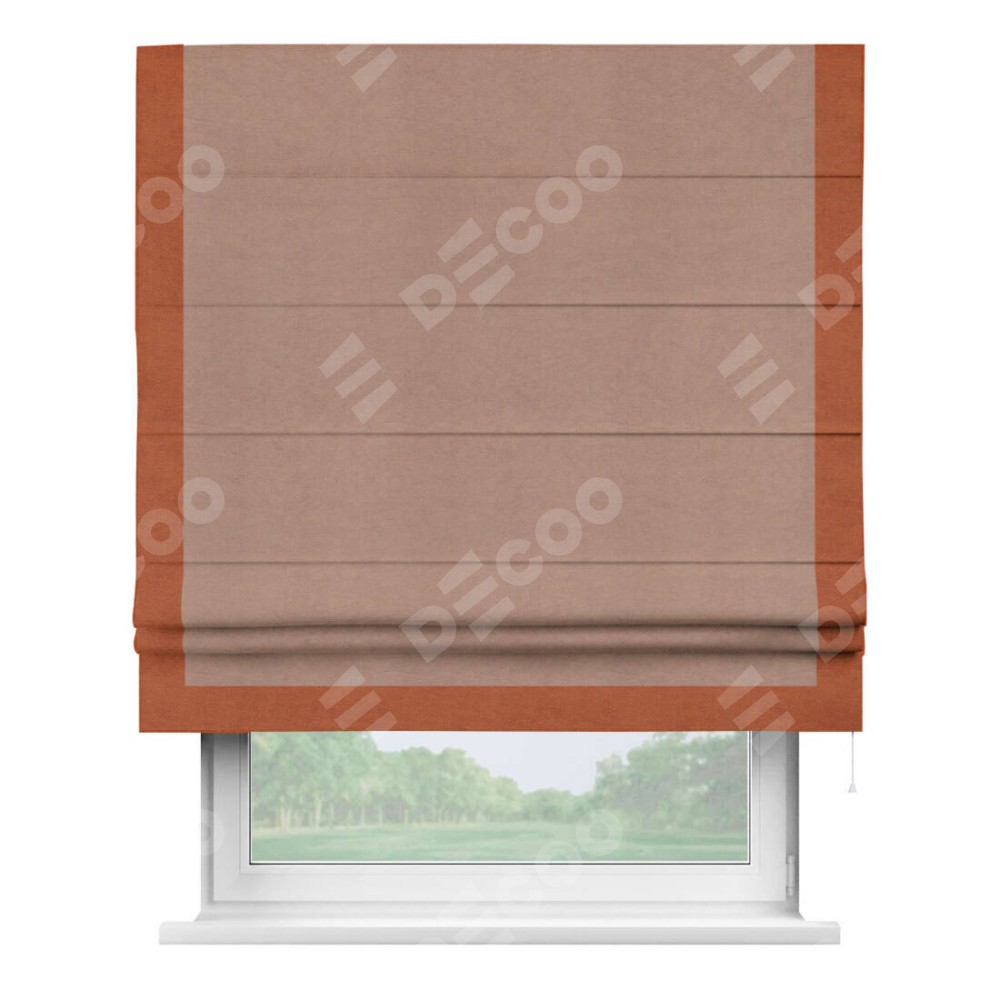 Римская штора производителя «Cortin», используется для проёма, пошита из ткани вельвет брусничный джем, артикул ткани 17750. Отделка шторы кантом «Виктория», ткань для канта используется из вельвета разной расцветки на выбор. Имеет универсальный механизм и подходит для монтажа: на потолок, на стену и в нишу.