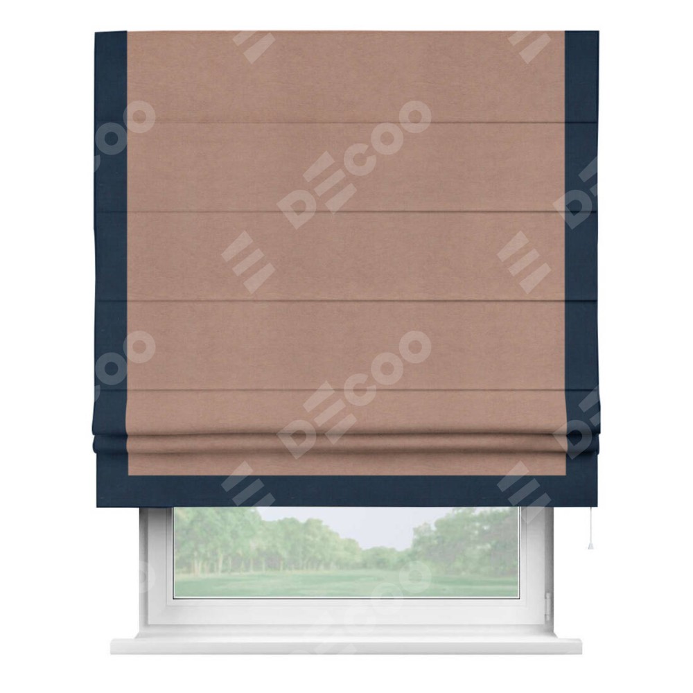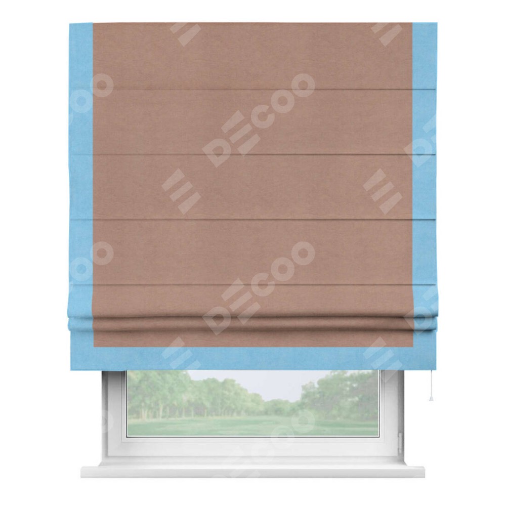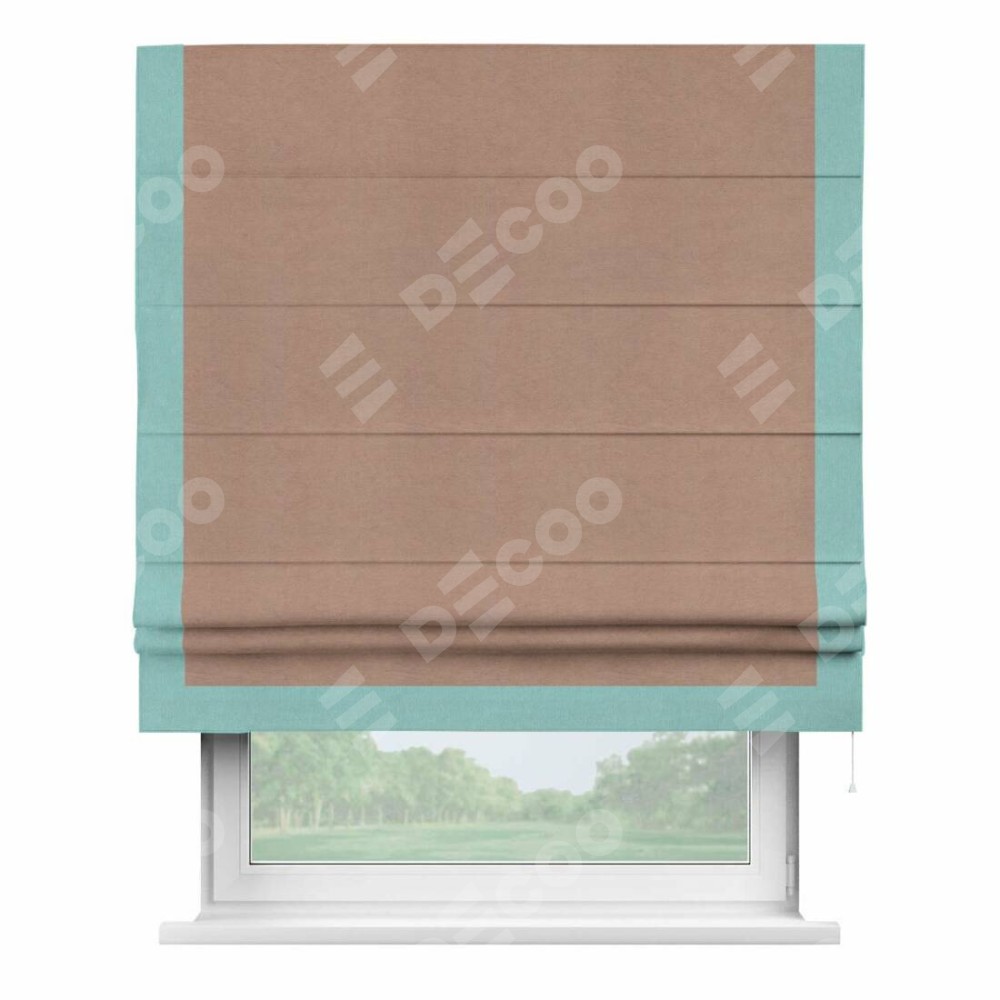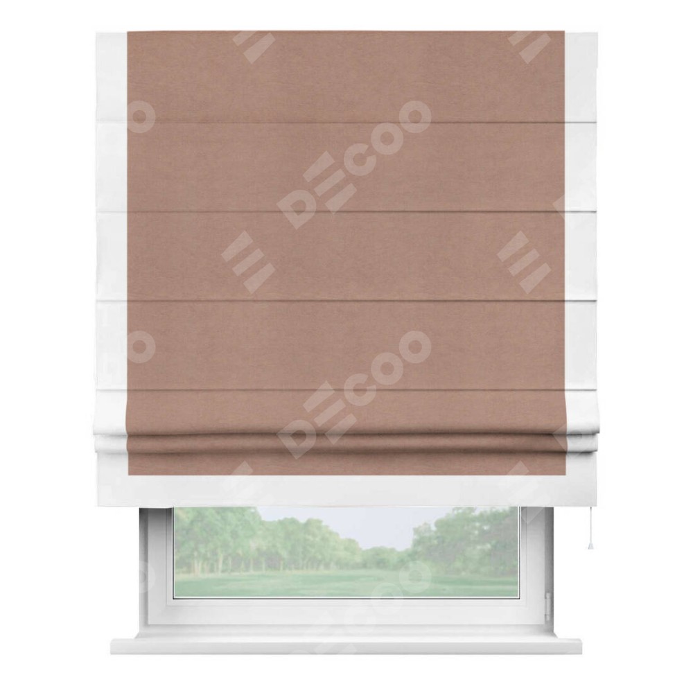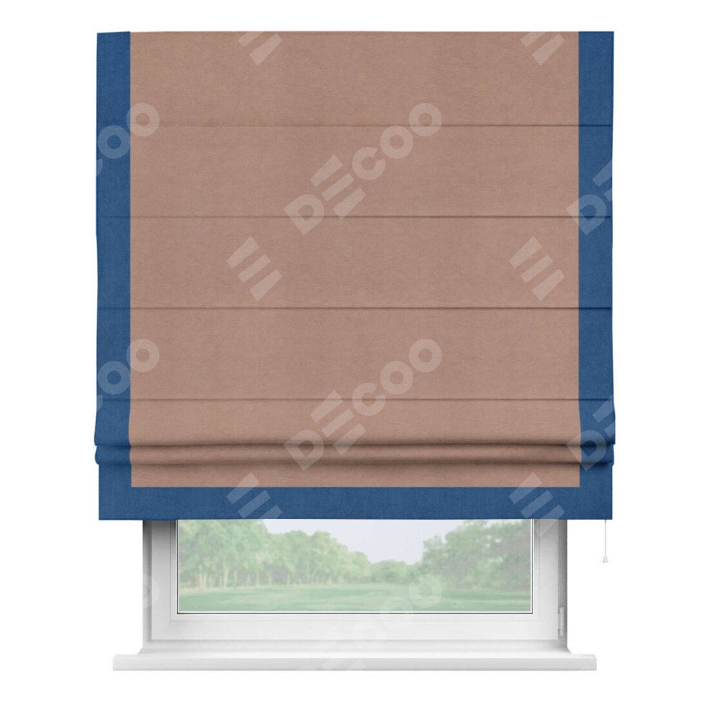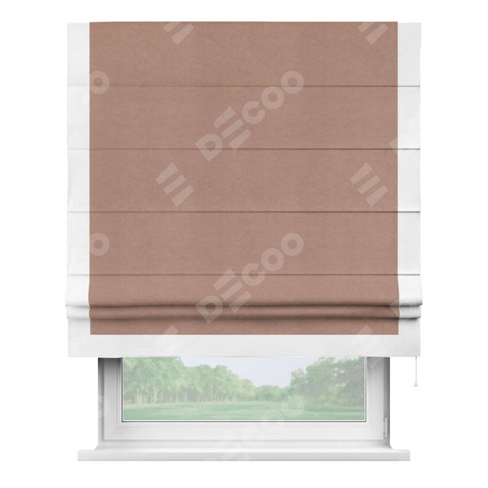 Римская штора производителя «Cortin», используется для проёма, пошита из ткани вельвет брусничный джем, артикул ткани 17750. Отделка шторы кантом «Виктория», ткань для канта используется из вельвета разной расцветки на выбор. Имеет универсальный механизм и подходит для монтажа: на потолок, на стену и в нишу.