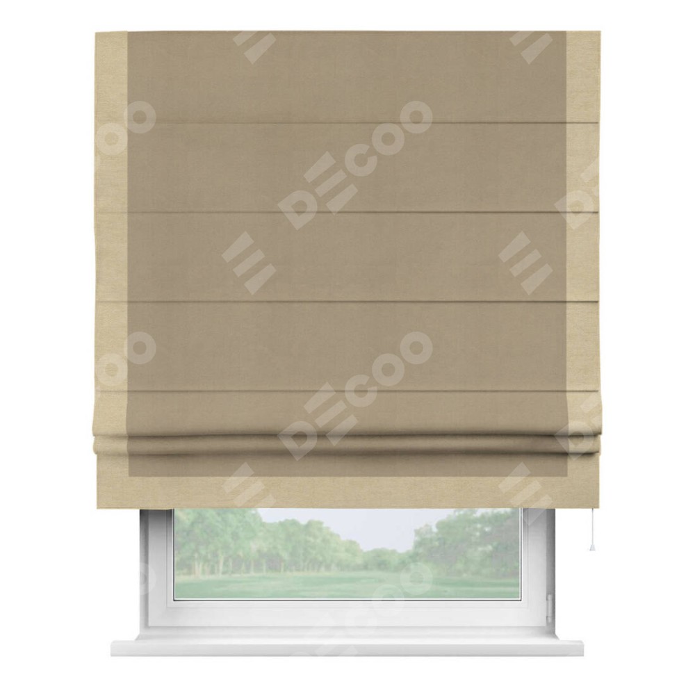 Римская штора производителя «Cortin», используется для проёма, пошита из ткани вельвет кофейный, артикул ткани 30980. Отделка шторы кантом «Виктория», ткань для канта используется из вельвета разной расцветки на выбор. Имеет универсальный механизм и подходит для монтажа: на потолок, на стену и в нишу.
