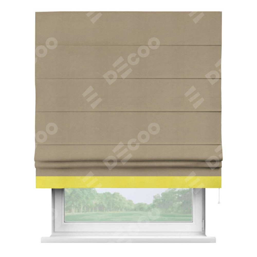 Римская штора производителя «Cortin», используется для проёма, пошита из ткани вельвет кофейный, артикул ткани 30980. Отделка шторы кантом «Джестер», ткань для канта используется из вельвета разной расцветки на выбор. Имеет универсальный механизм и подходит для монтажа: на потолок, на стену и в нишу.