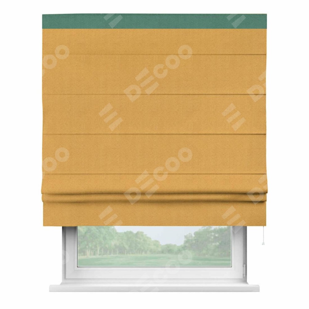 Римская штора производителя «Cortin», используется для проёма, пошита из ткани блэкаут с блеском золотой, артикул 34626. Отделка шторы кантом «Кинг», ткань для канта используется из блэкаута с блеском разной расцветки на выбор. Изнаночная сторона материала черного цвета, что обеспечивает необходимую светонепроницаемость. Имеет универсальный механизм и подходит для монтажа: на потолок, на стену и в нишу.