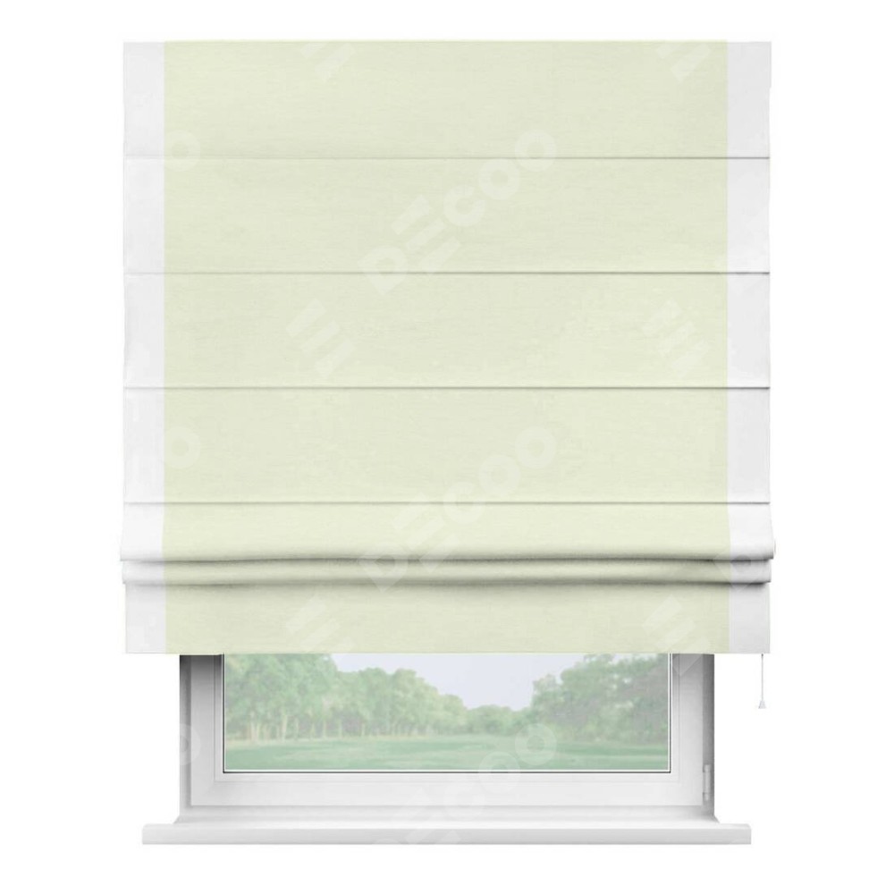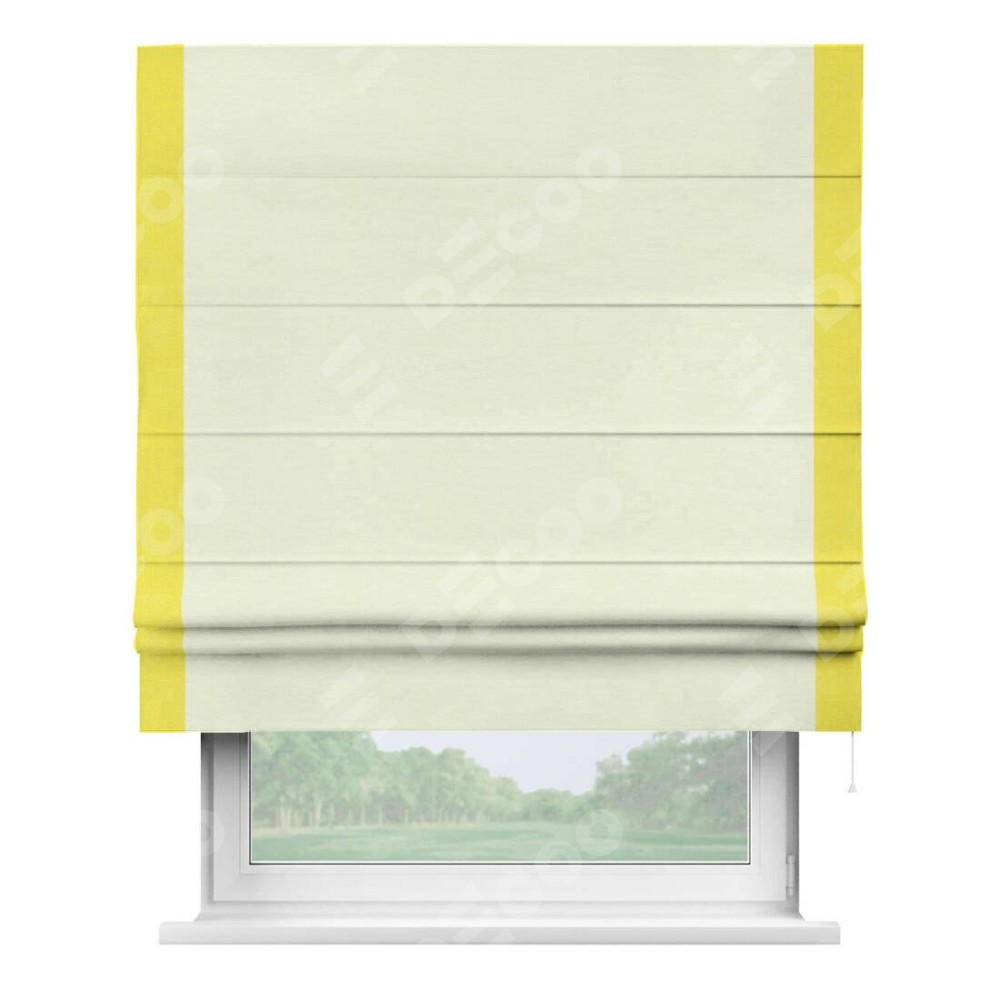 Римская штора производителя «Cortin», используется для проёма, пошита из ткани вельвет молочный, артикул ткани 85536. Отделка шторы кантом «Стрим Дуо», ткань для канта используется из вельвета разной расцветки на выбор. Имеет универсальный механизм и подходит для монтажа: на потолок, на стену и в нишу.