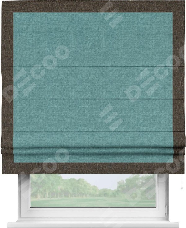 Римская штора производителя «Cortin», используется для проёма, пошита из ткани лён бирюза, артикул 7446. Отделка шторы кантом «Чесс», ткань для канта используется из льна разной расцветки на выбор. Имеет универсальный механизм и подходит для монтажа: на потолок, на стену и в нишу.