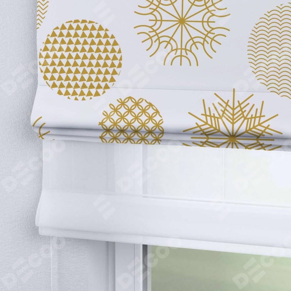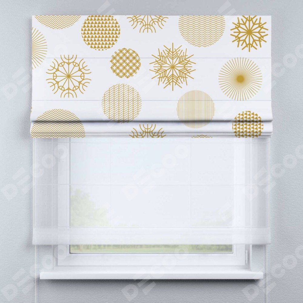 Римская штора день-ночь производителя «Cortin», используется для проёма, пошита из двух полотен, с лицевой блэкаут с нанесением сублимационной печати «Золотые шары», вторая ткань тюль (по стандарту комплектуется тюль белого цвета артикул V-01). Имеет универсальный механизм и подходит для монтажа: на потолок, на стену и в нишу.