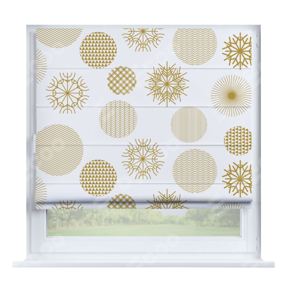 Римская штора производителя «Cortin», устанавливается на створку окна, пошита из ткани блэкаут с нанесением сублимационной печати «Золотые шары». Штора шьётся по индивидуальным размерам, для данного типа римской шторы возможная ширина от 35 до 150 см., высота до 250 см.