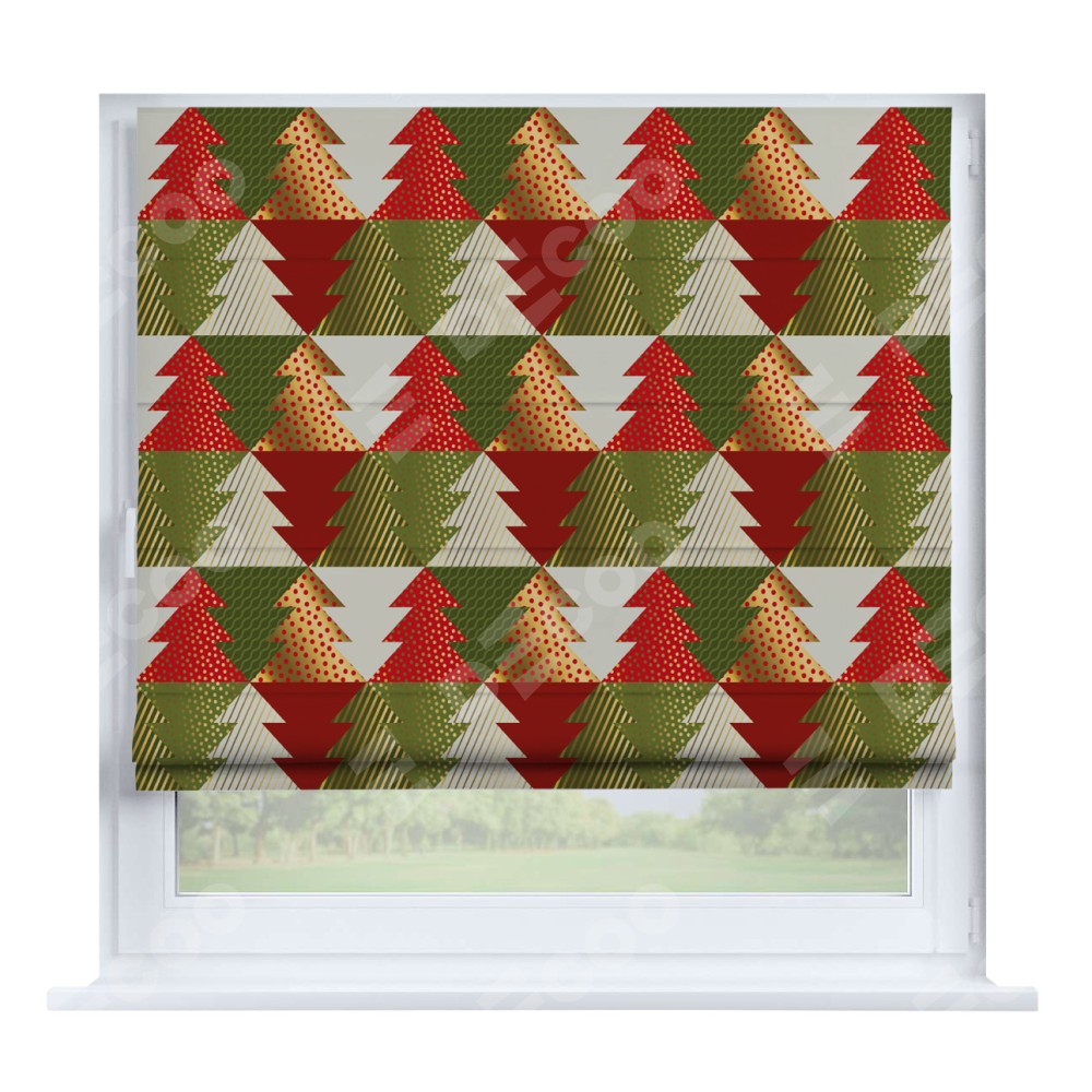 Римская штора производителя «Cortin», устанавливается на створку окна, пошита из ткани блэкаут с нанесением сублимационной печати «Новогоднее украшение». Штора шьётся по индивидуальным размерам, для данного типа римской шторы возможная ширина от 35 до 150 см., высота до 250 см.