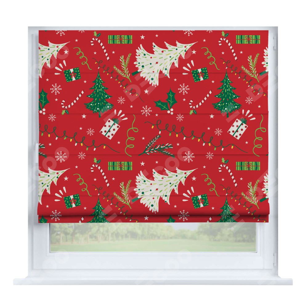 Римская штора производителя «Cortin», устанавливается на створку окна, пошита из ткани блэкаут с нанесением сублимационной печати «Новогодние подарки». Штора шьётся по индивидуальным размерам, для данного типа римской шторы возможная ширина от 35 до 150 см., высота до 250 см.