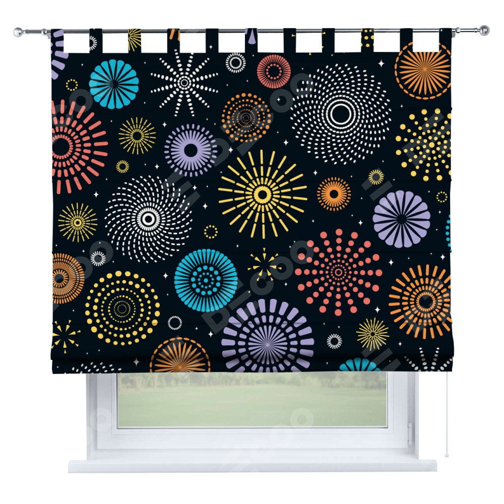 Римская штора производителя «Cortin», используется для проёма, пошита из ткани блэкаут с нанесением сублимационной печати «Праздничный фейерверк». Данная модель пошита на петлях, комплектуется на выбор круглым карнизом и подходит для монтажа на стену. Римская штора на петлях имеет простую систему регулировки высоты, отличительным преимуществом данной модели является простой способ монтажа. Достаточно повесить ее на трубу и штора готова!