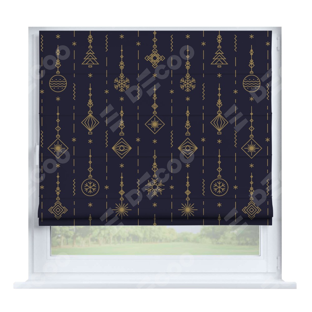 Римская штора производителя «Cortin», устанавливается на створку окна, пошита из ткани блэкаут с нанесением сублимационной печати «Сияние гирлянд». Штора шьётся по индивидуальным размерам, для данного типа римской шторы возможная ширина от 35 до 150 см., высота до 250 см.