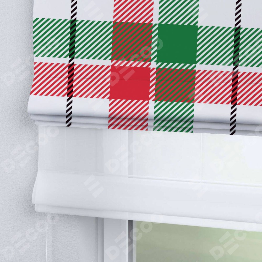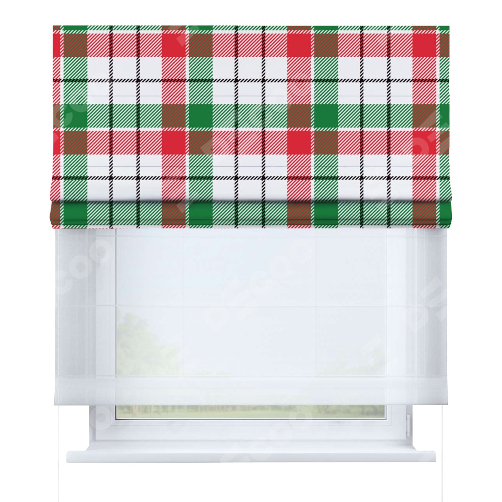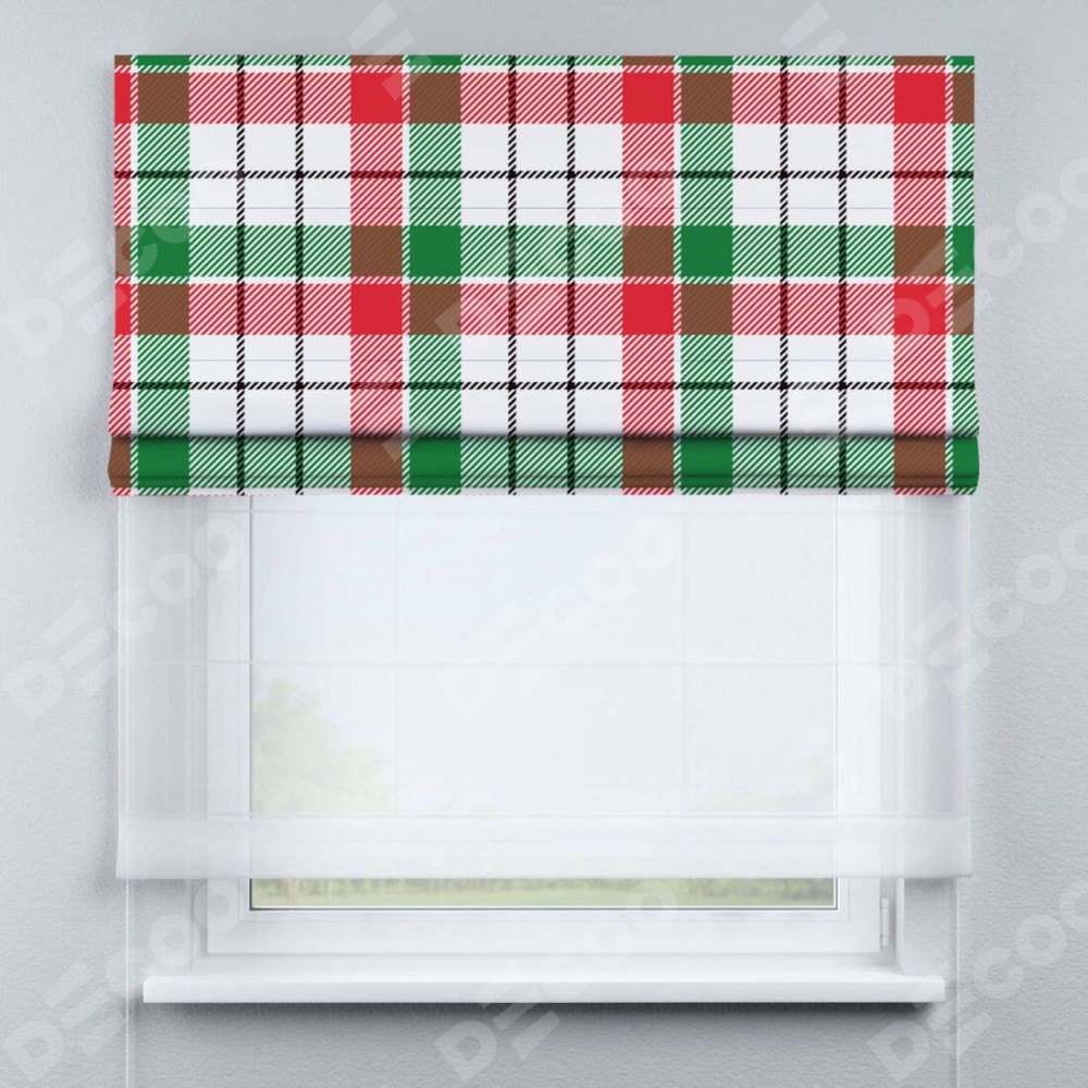 Римская штора день-ночь производителя «Cortin», используется для проёма, пошита из двух полотен, с лицевой блэкаут с нанесением сублимационной печати «Трёхцветная клетка», вторая ткань тюль (по стандарту комплектуется тюль белого цвета артикул V-01). Имеет универсальный механизм и подходит для монтажа: на потолок, на стену и в нишу.
