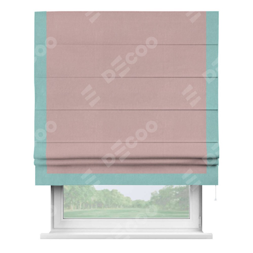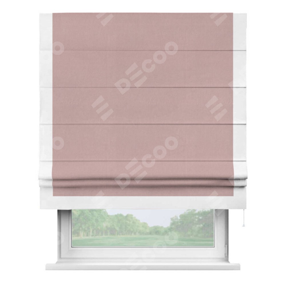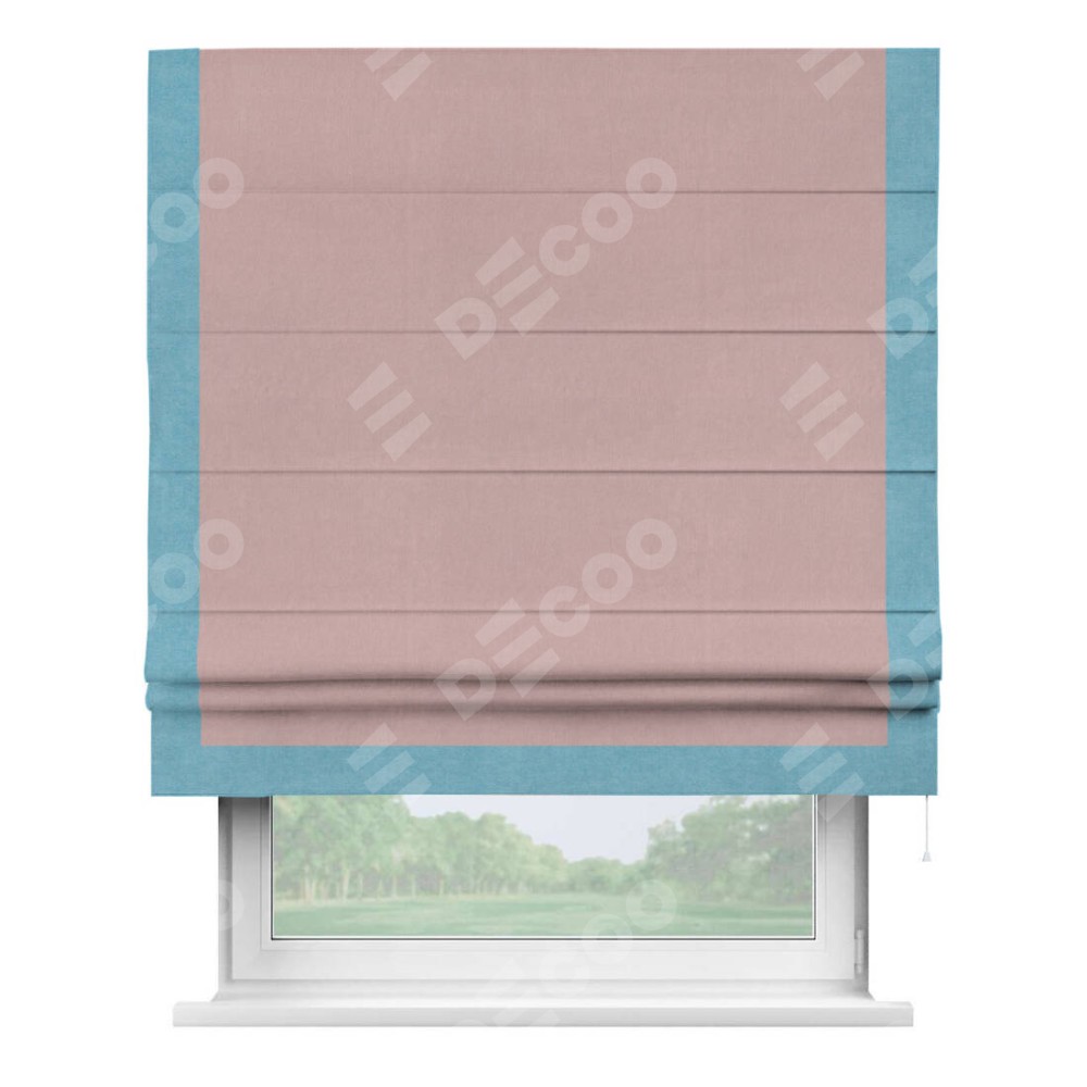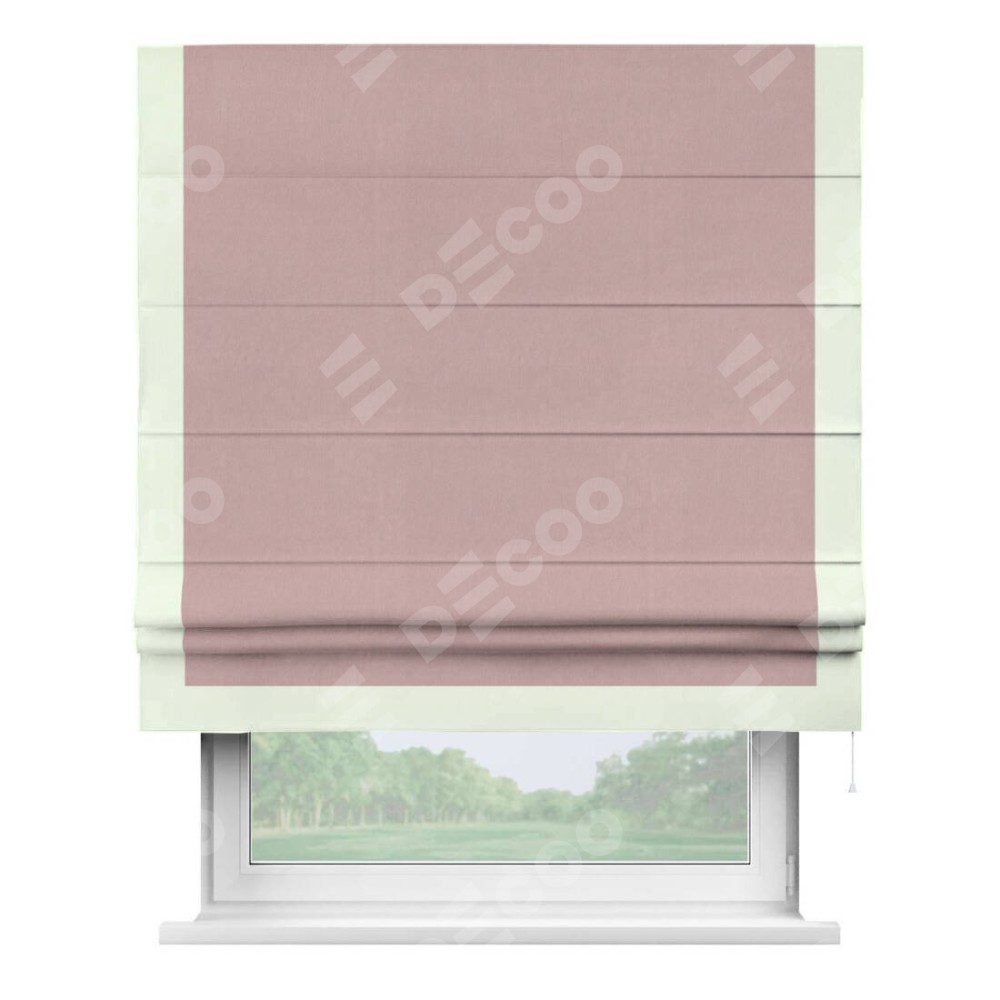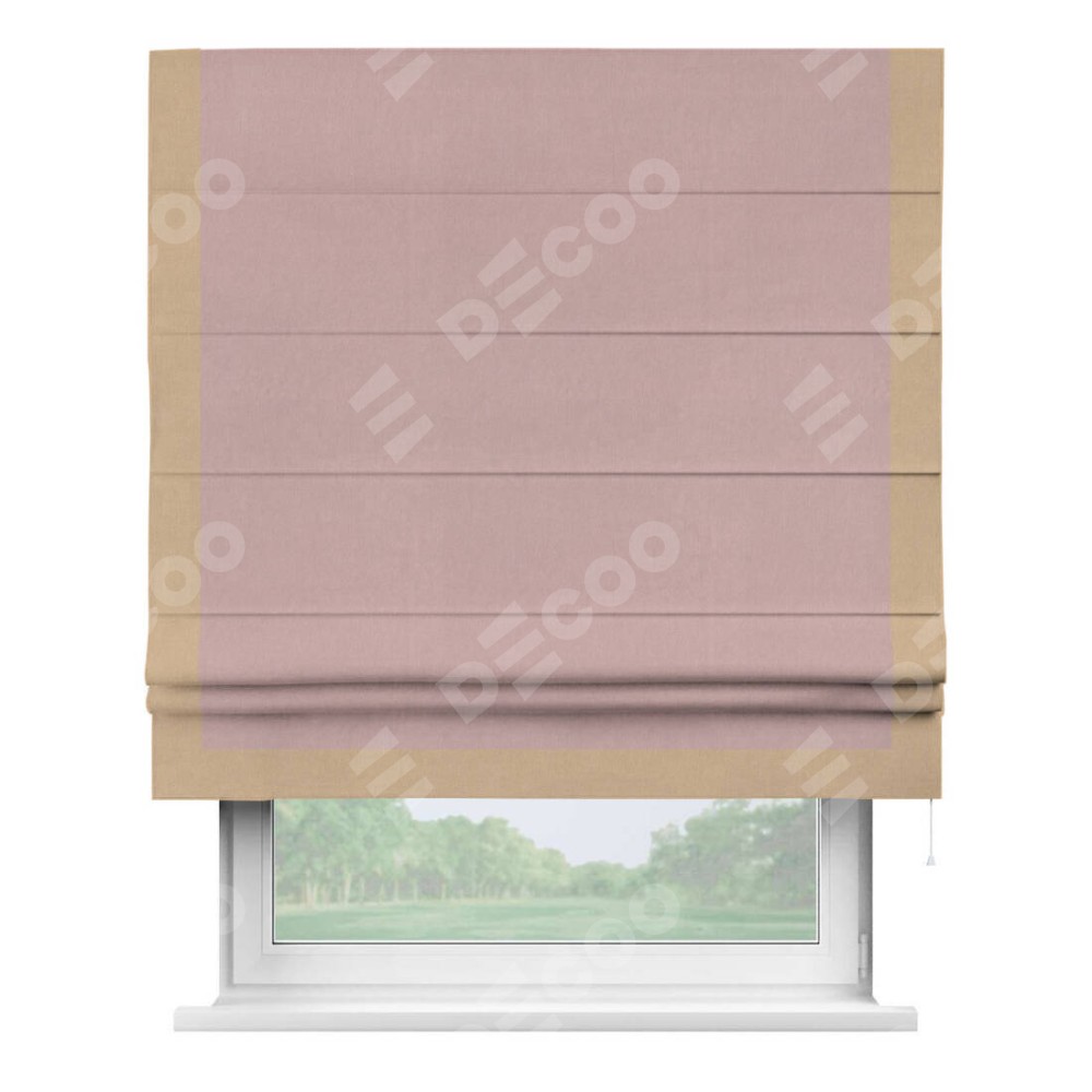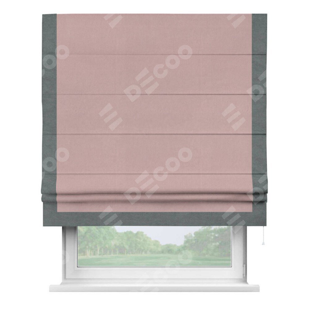 Римская штора производителя «Cortin», используется для проёма, пошита из ткани вельвет розовая пудра, артикул ткани 14132. Отделка шторы кантом «Виктория», ткань для канта используется из вельвета разной расцветки на выбор. Имеет универсальный механизм и подходит для монтажа: на потолок, на стену и в нишу.