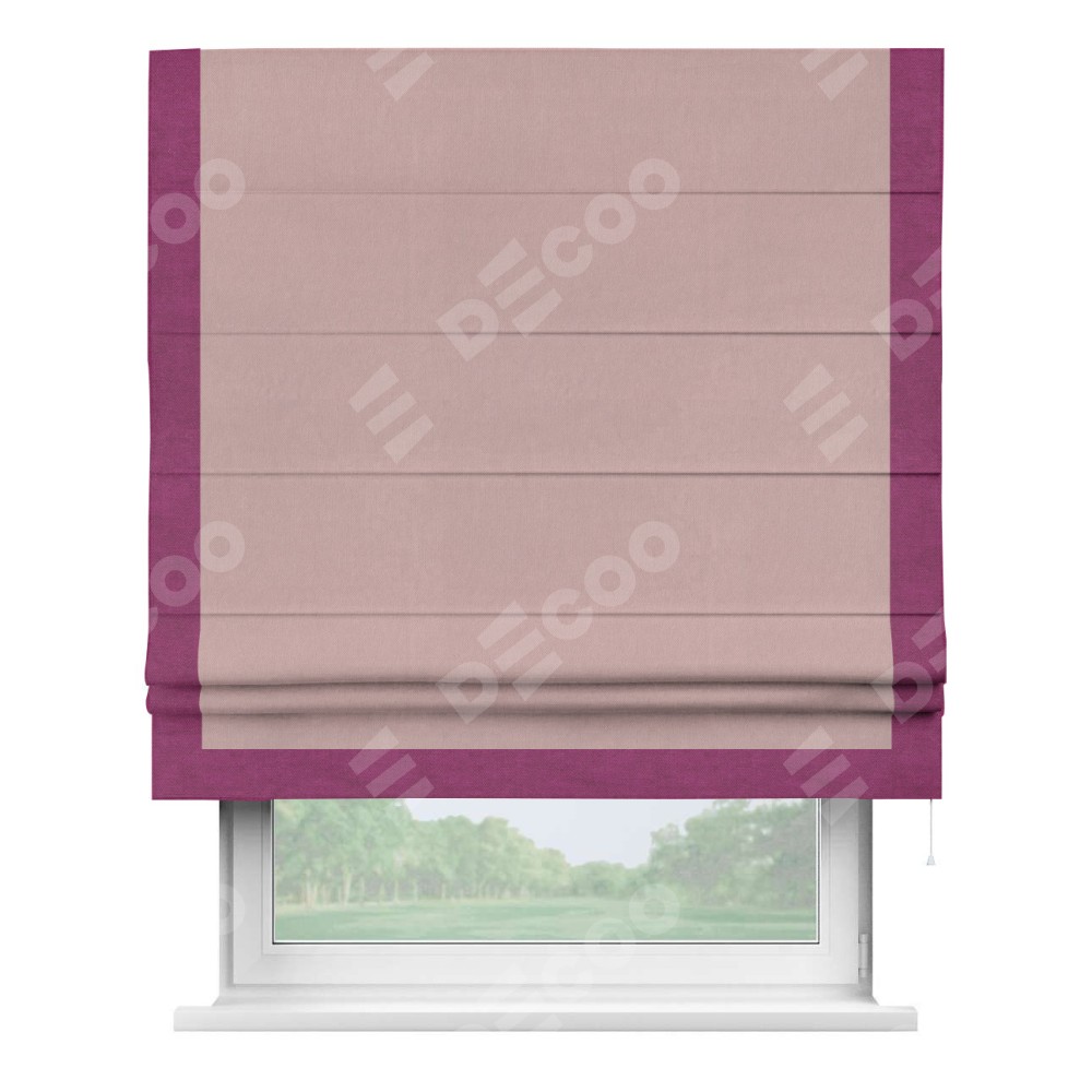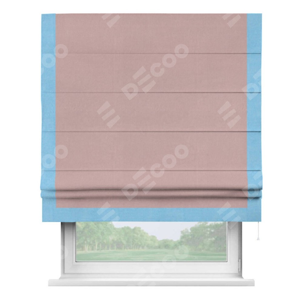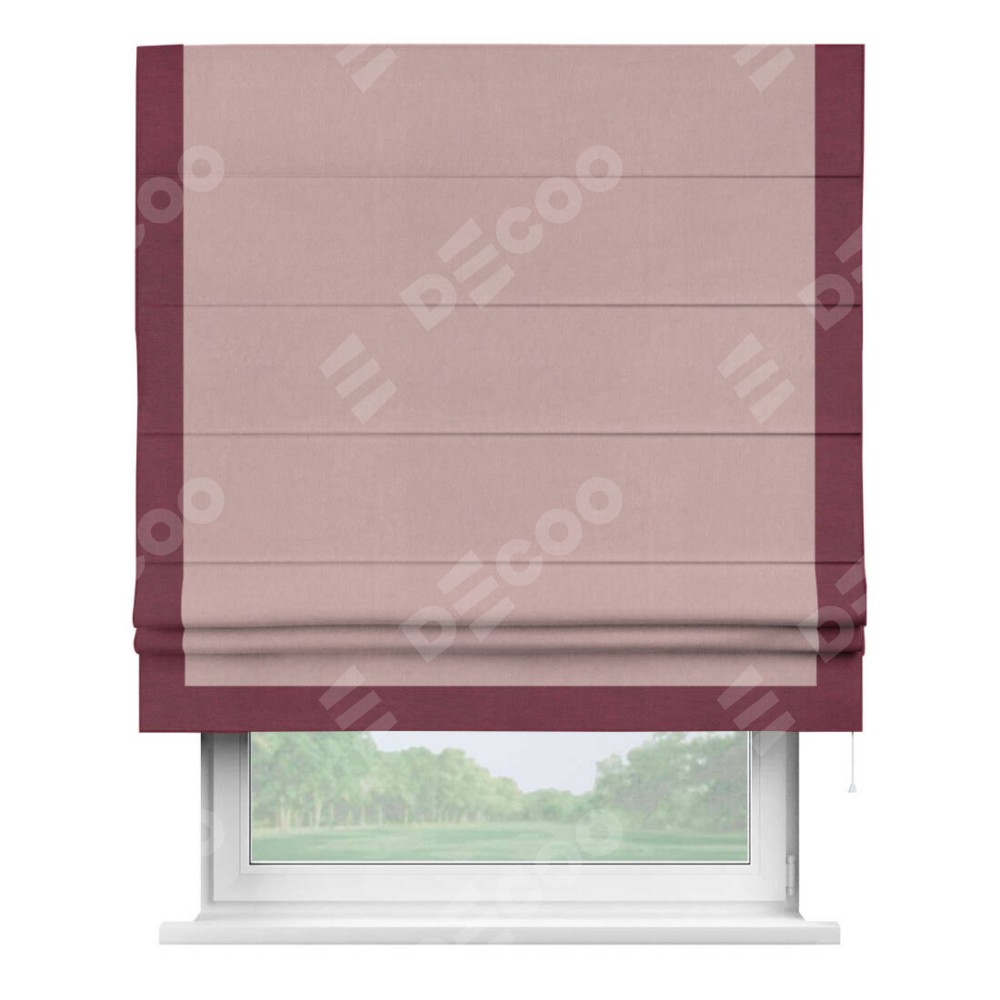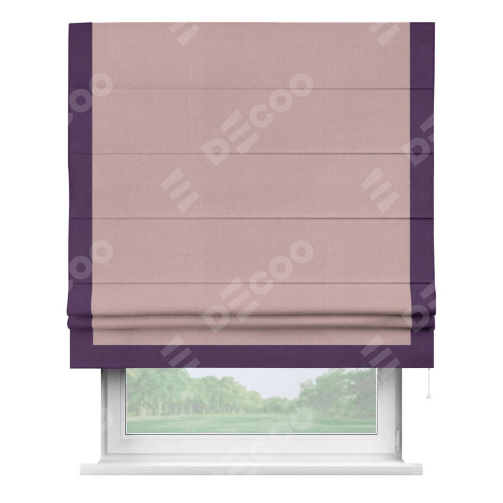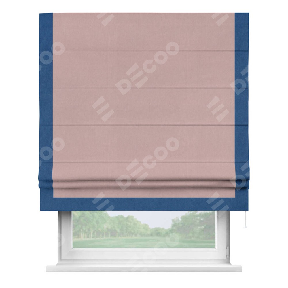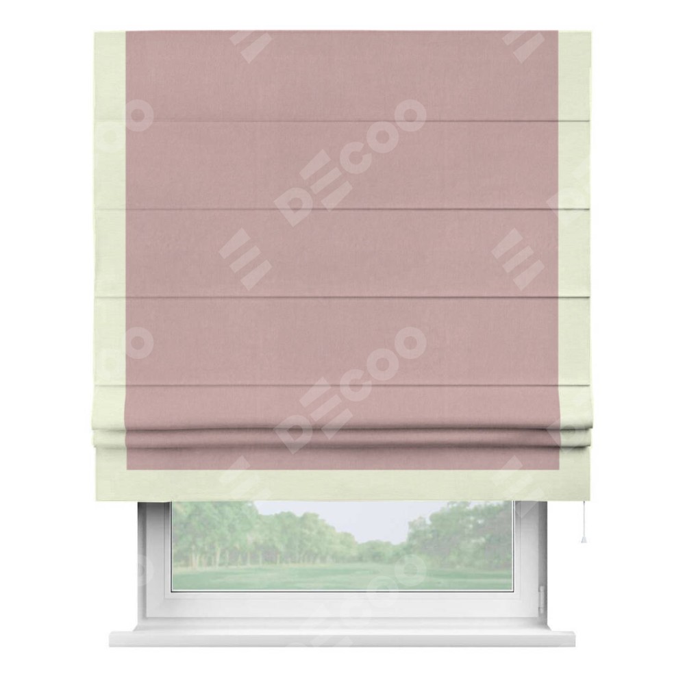 Римская штора производителя «Cortin», используется для проёма, пошита из ткани вельвет розовая пудра, артикул ткани 14132. Отделка шторы кантом «Виктория», ткань для канта используется из вельвета разной расцветки на выбор. Имеет универсальный механизм и подходит для монтажа: на потолок, на стену и в нишу.