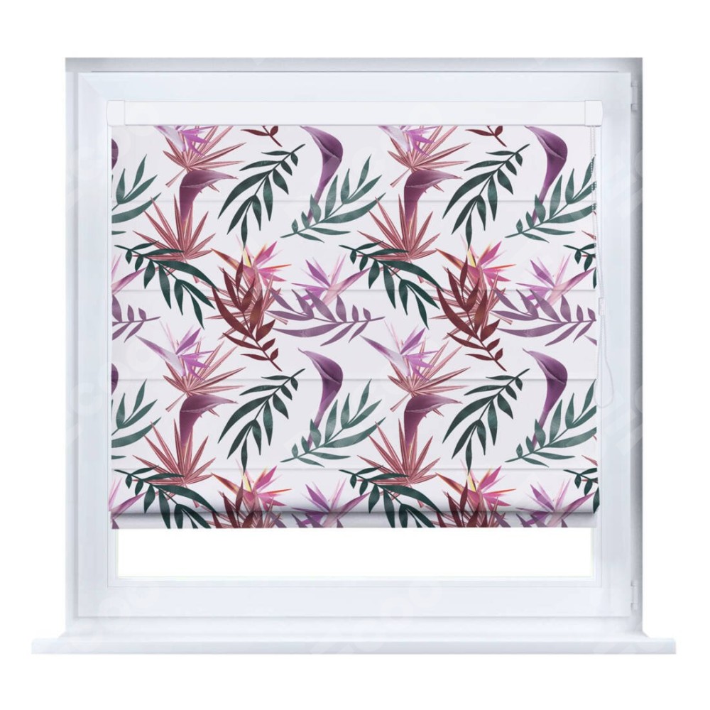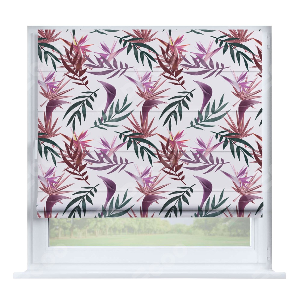 Римская штора производителя «Cortin», устанавливается на створку окна, пошита из ткани блэкаут с нанесением сублимационной печати «Тропические побеги». Штора шьётся по индивидуальным размерам, для данного типа римской шторы возможная ширина от 35 до 150 см., высота до 250 см.