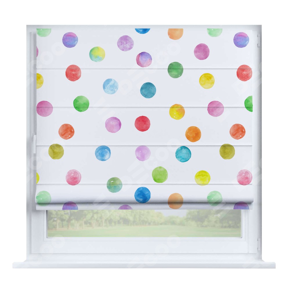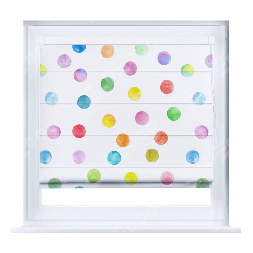 Римская штора производителя «Cortin», устанавливается на створку окна, пошита из ткани блэкаут с нанесением сублимационной печати «Цветные круги». Штора шьётся по индивидуальным размерам, для данного типа римской шторы возможная ширина от 35 до 150 см., высота до 250 см.