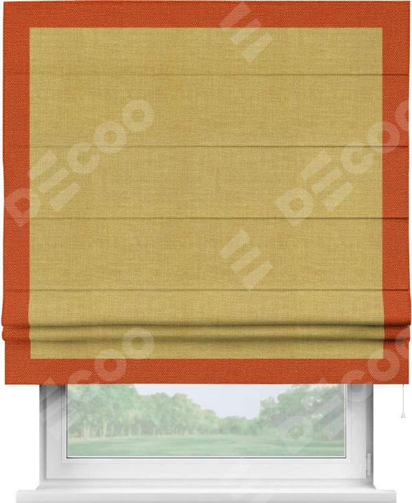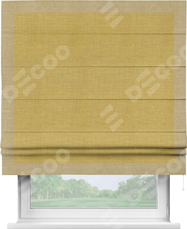 Римская штора производителя «Cortin», используется для проёма, пошита из ткани лён горчичный, артикул 74740. Отделка шторы кантом «Чесс», ткань для канта используется из льна разной расцветки на выбор. Имеет универсальный механизм и подходит для монтажа: на потолок, на стену и в нишу.