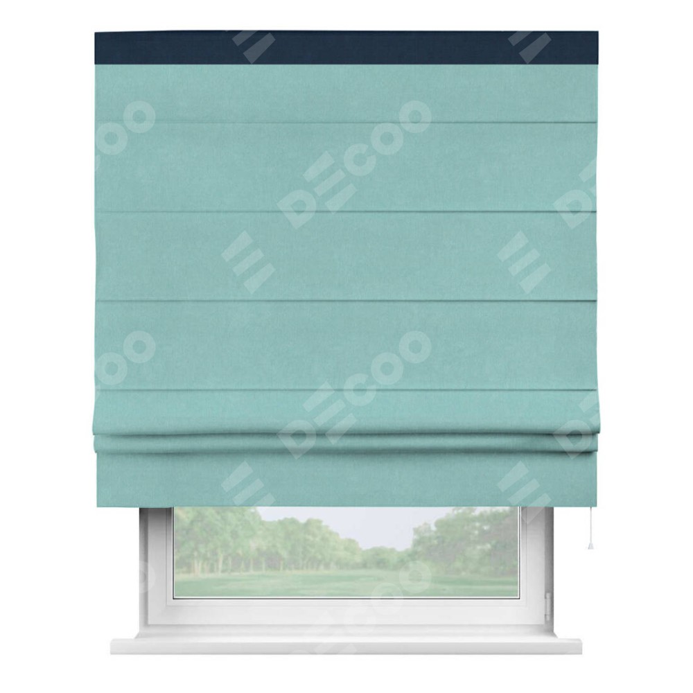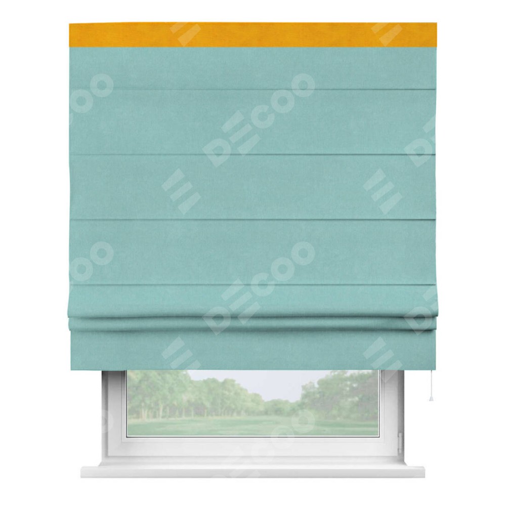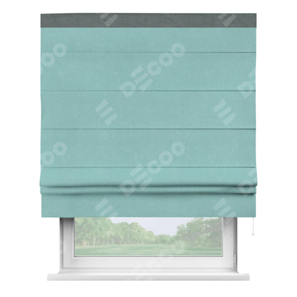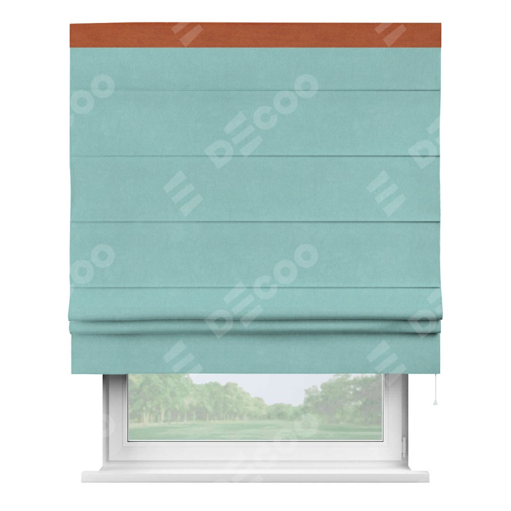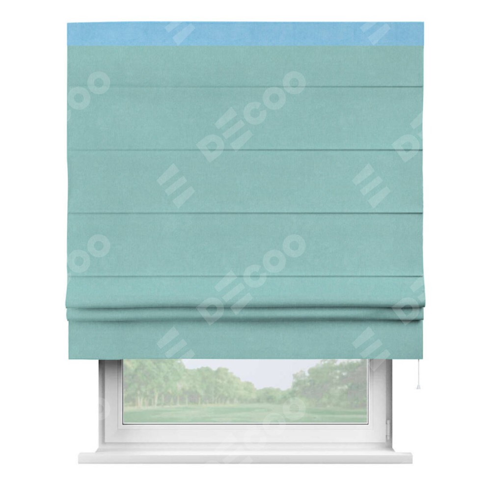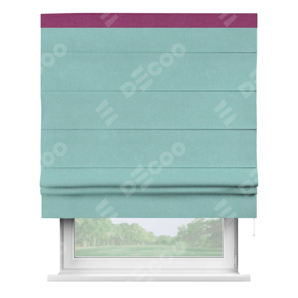 Римская штора производителя «Cortin», используется для проёма, пошита из ткани вельвет тиффани, артикул ткани 17765. Отделка шторы кантом «Кинг», ткань для канта используется из вельвета разной расцветки на выбор. Имеет универсальный механизм и подходит для монтажа: на потолок, на стену и в нишу.