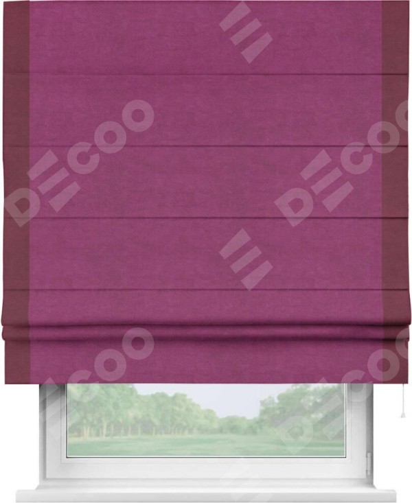 Римская штора производителя «Cortin», используется для проёма, пошита из ткани вельвет фиолетовый, артикул ткани 85552. Отделка шторы кантом «Стрим Дуо», ткань для канта используется из вельвета разной расцветки на выбор. Имеет универсальный механизм и подходит для монтажа: на потолок, на стену и в нишу.