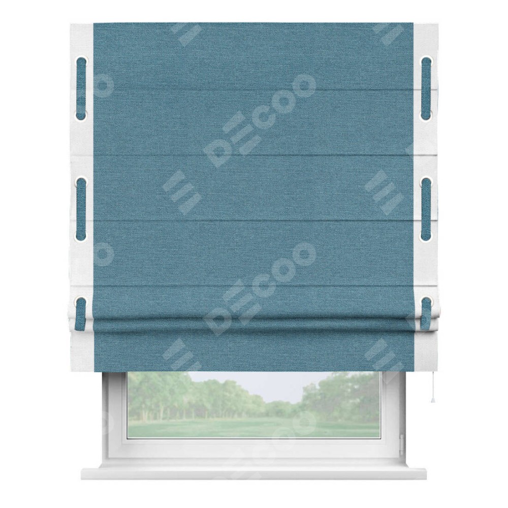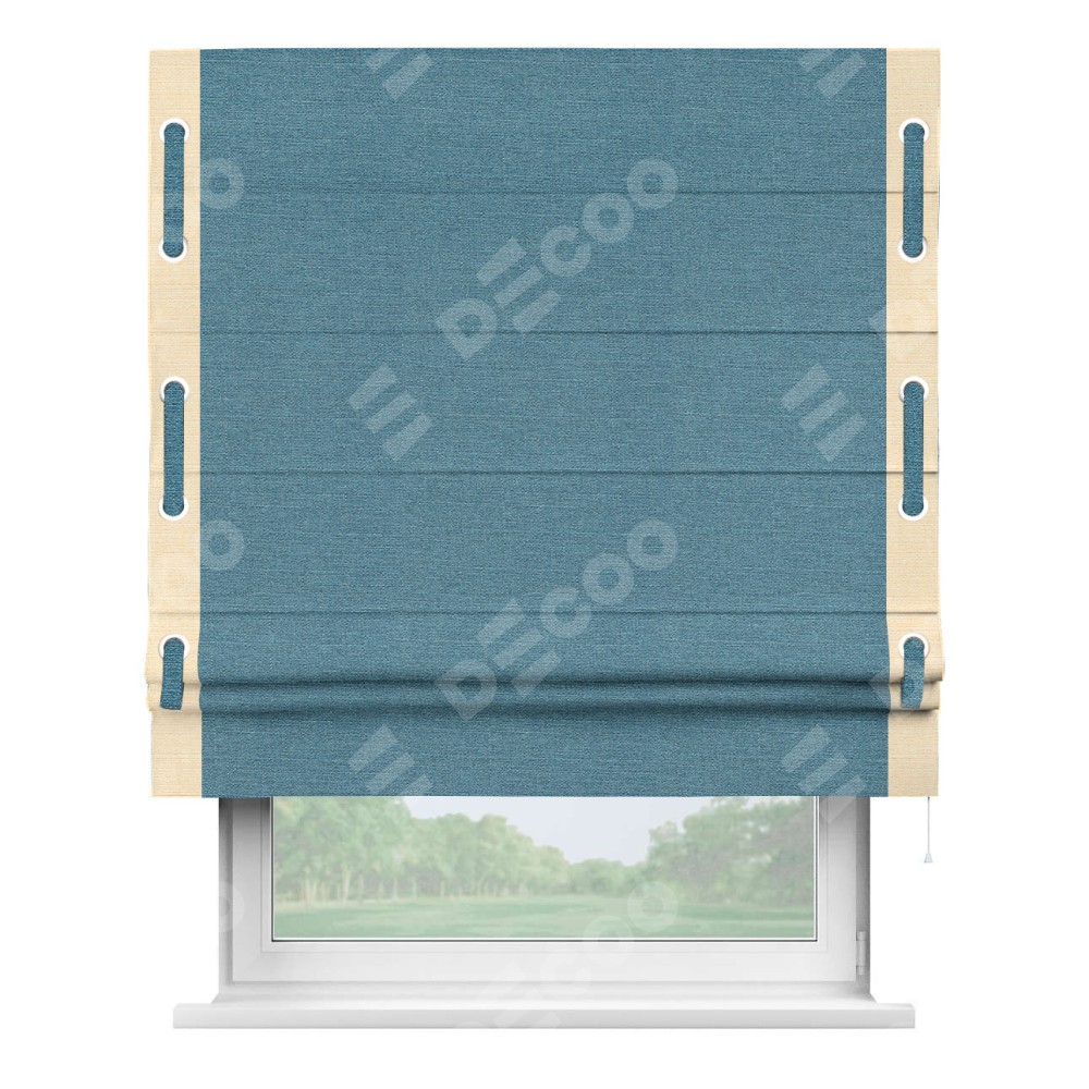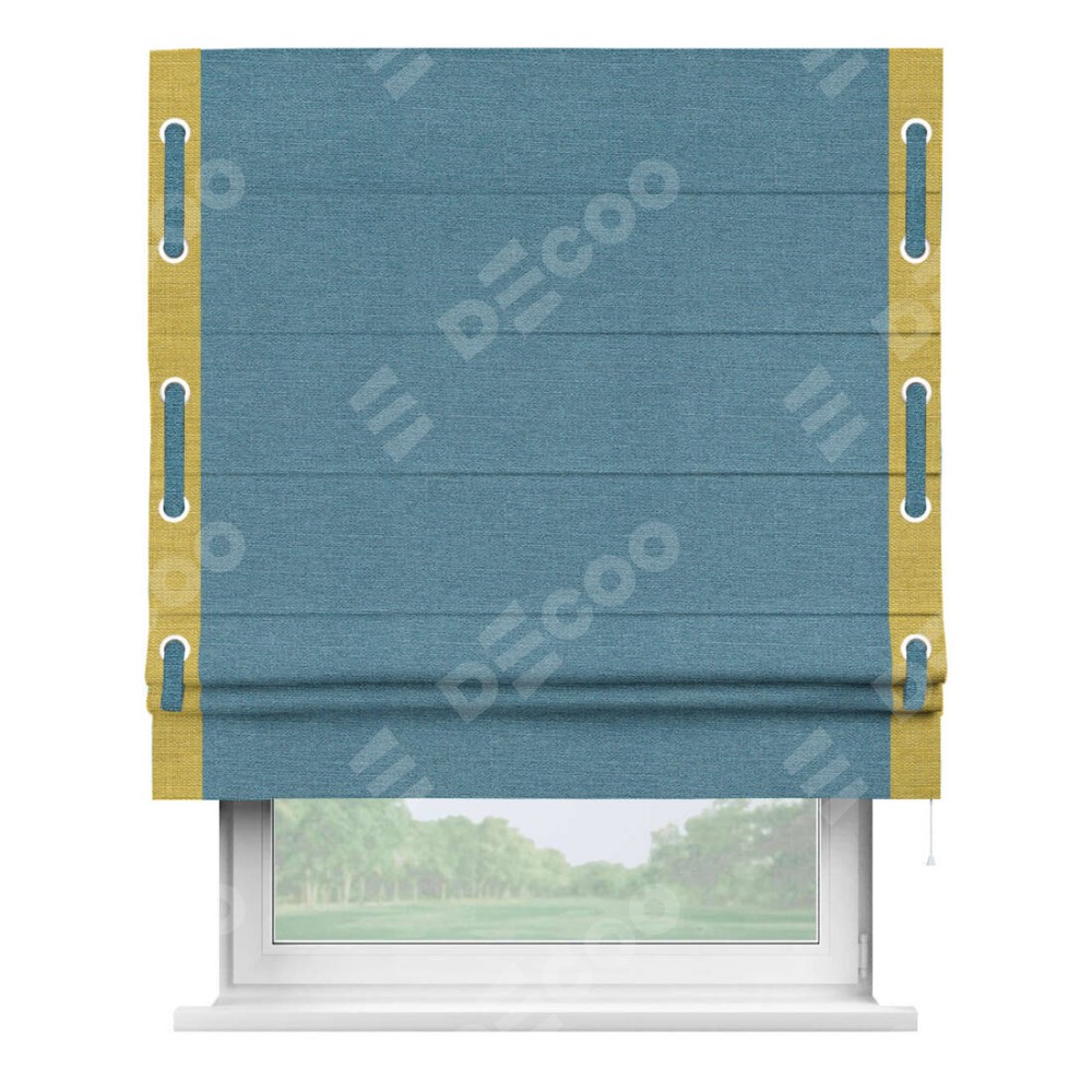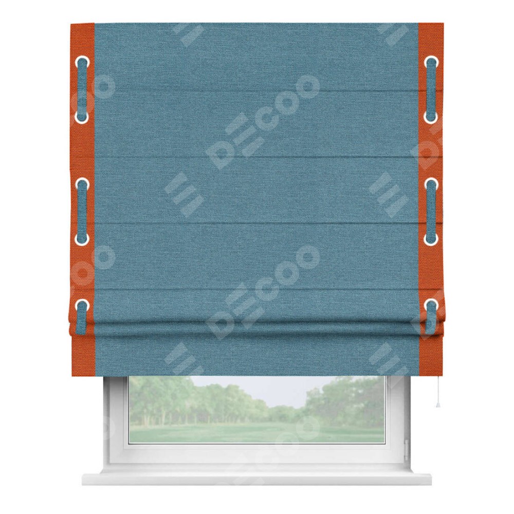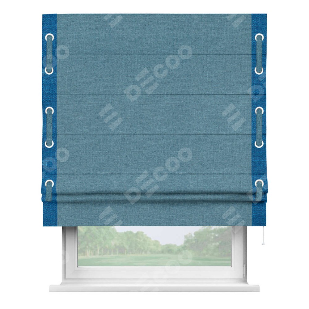 Римская штора производителя «Cortin», используется для проёма, пошита из ткани лён голубой, артикул 63741. Отделка шторы кантом «Стрим Дуо» на кантах расположены люверсы с пояском, ткань для канта используется из льна разной расцветки на выбор. Ткань для пояска обычно используется из основной ткани шторы, а так же можно сделать из любой расцветки по желанию. Имеет универсальный механизм и подходит для монтажа: на потолок, на стену и в нишу.