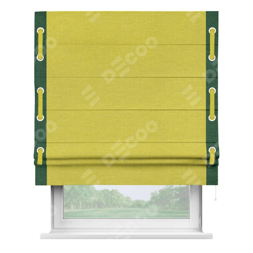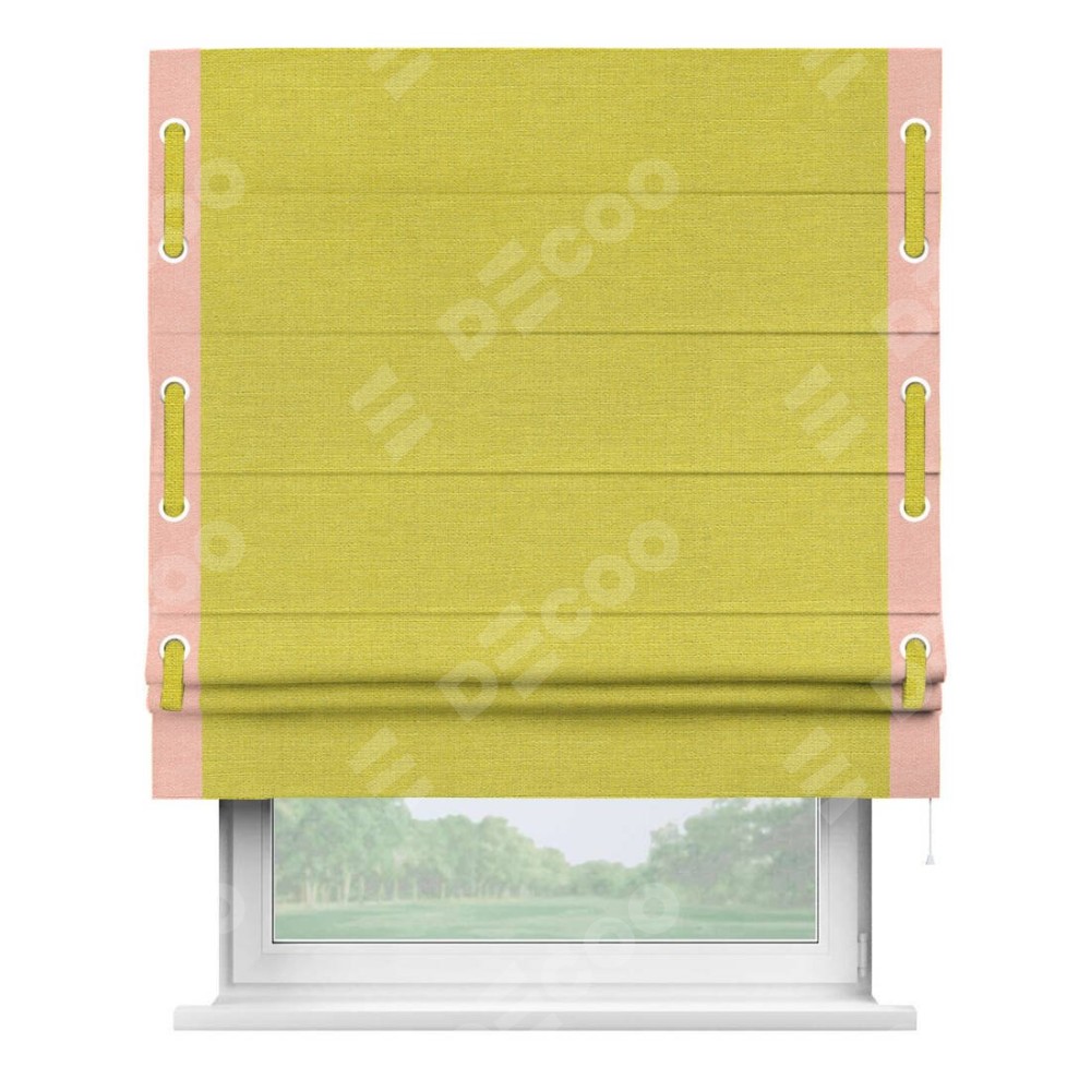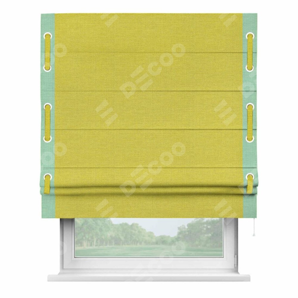 Римская штора производителя «Cortin», используется для проёма, пошита из ткани лён салатовый, артикул 53437. Отделка шторы кантом «Стрим Дуо» на кантах расположены люверсы с пояском, ткань для канта используется из льна разной расцветки на выбор. Ткань для пояска обычно используется из основной ткани шторы, а так же можно сделать из любой расцветки по желанию. Имеет универсальный механизм и подходит для монтажа: на потолок, на стену и в нишу.