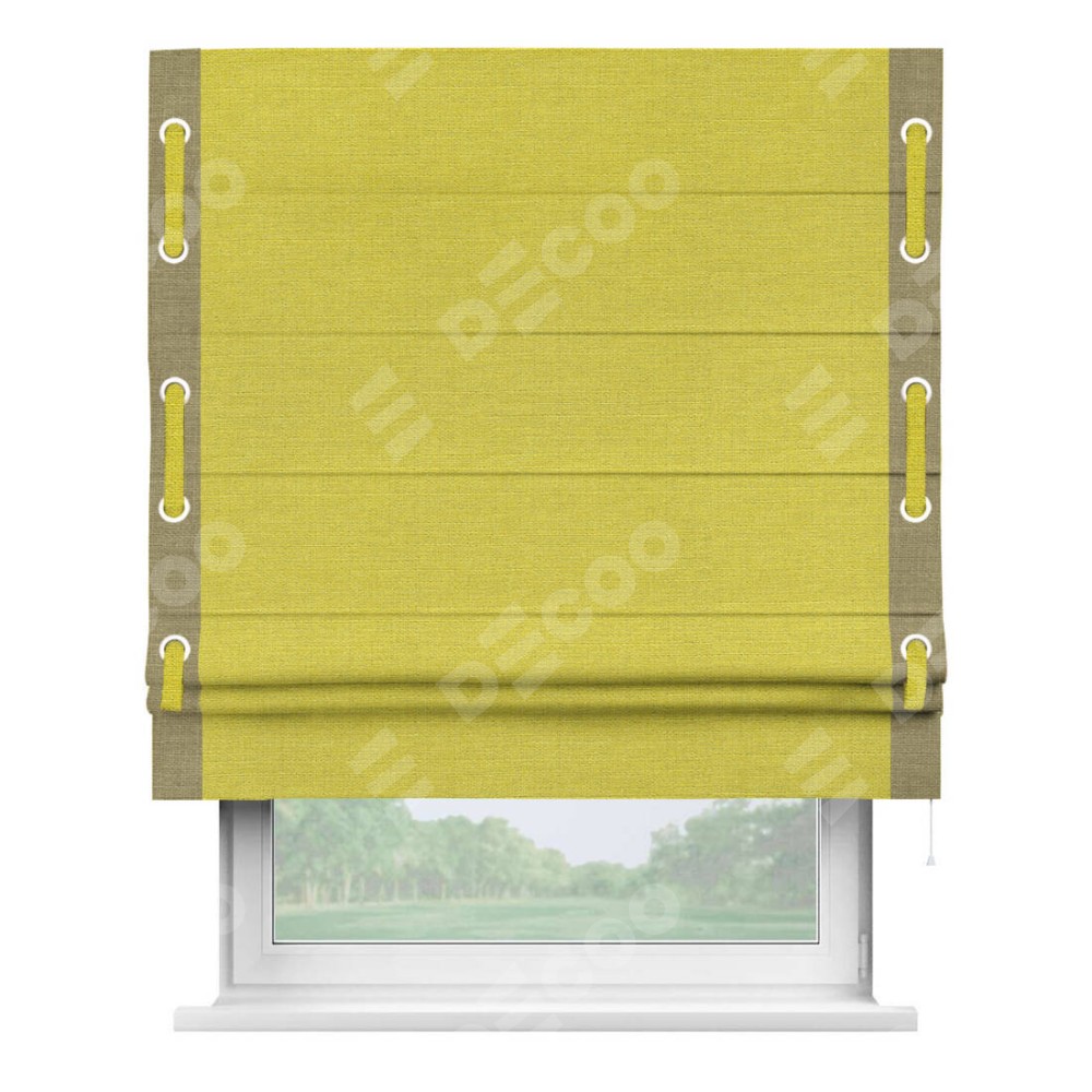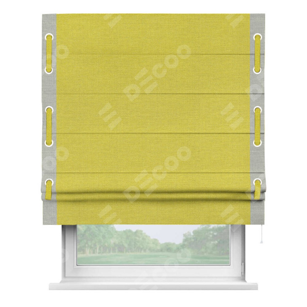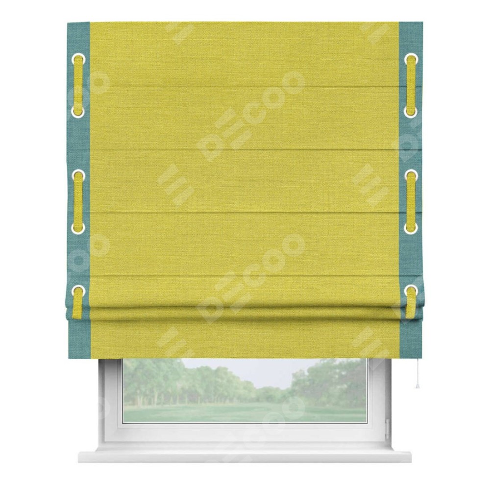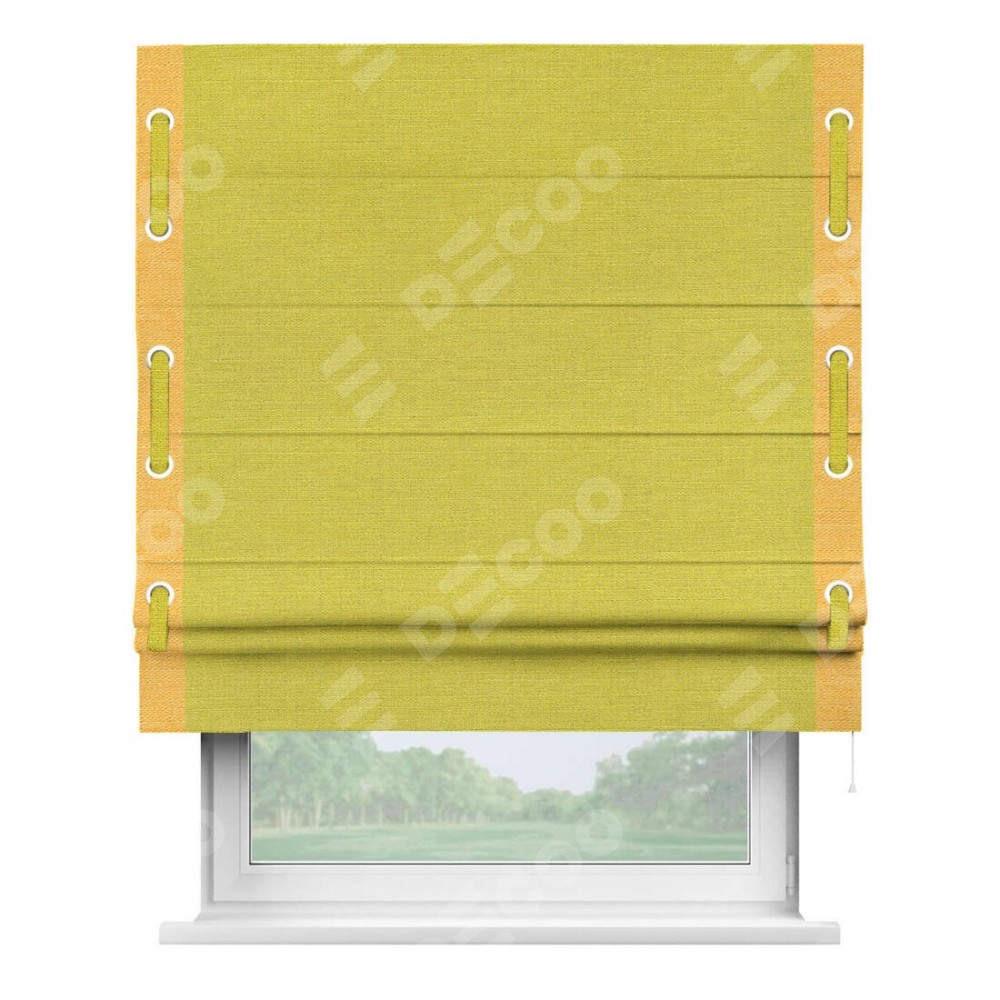 Римская штора производителя «Cortin», используется для проёма, пошита из ткани лён салатовый, артикул 53437. Отделка шторы кантом «Стрим Дуо» на кантах расположены люверсы с пояском, ткань для канта используется из льна разной расцветки на выбор. Ткань для пояска обычно используется из основной ткани шторы, а так же можно сделать из любой расцветки по желанию. Имеет универсальный механизм и подходит для монтажа: на потолок, на стену и в нишу.