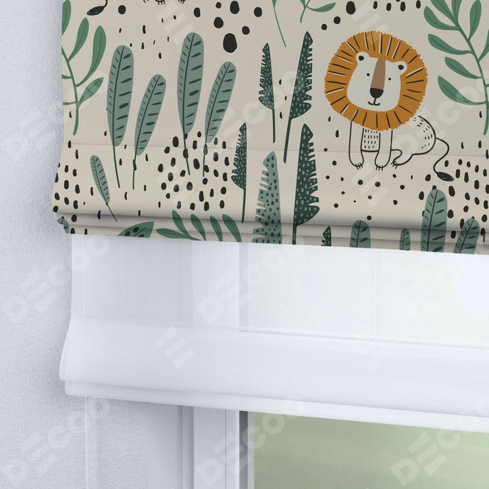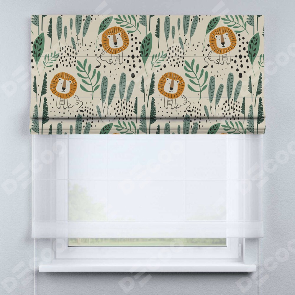 Римская штора день-ночь производителя «Cortin», используется для проёма, пошита из двух полотен, с лицевой блэкаут с нанесением сублимационной печати «Лев из джунглей», вторая ткань тюль (по стандарту комплектуется тюль белого цвета артикул V-01). Имеет универсальный механизм и подходит для монтажа: на потолок, на стену и в нишу.
