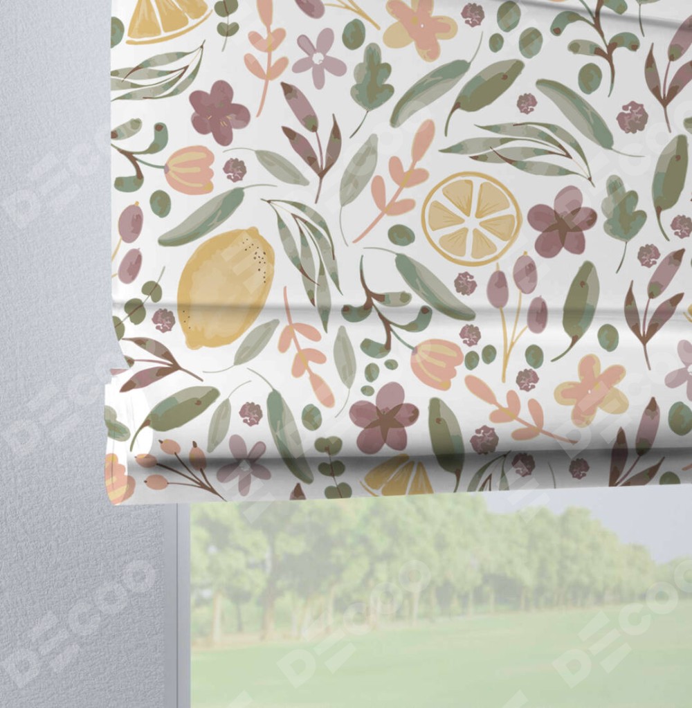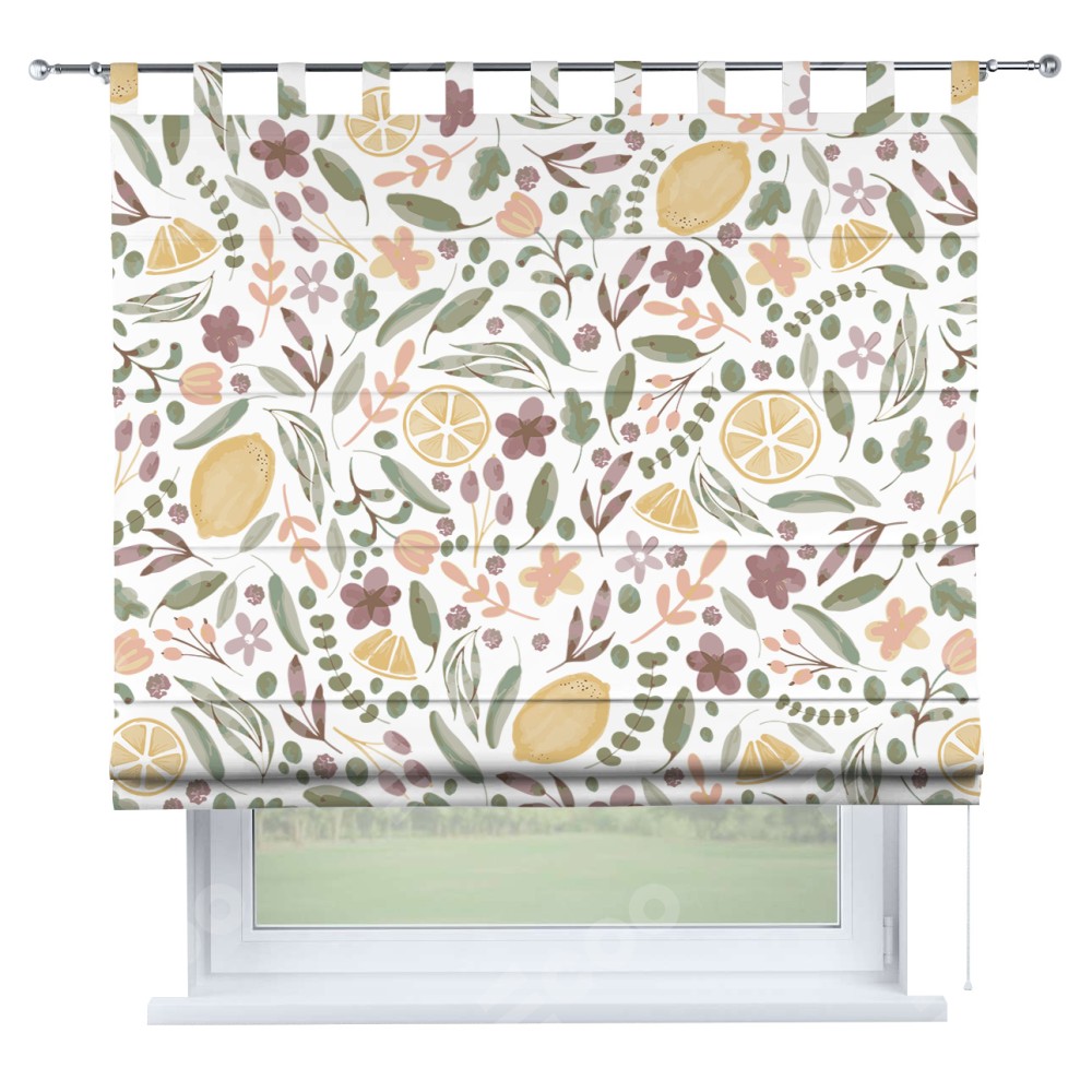 Римская штора производителя «Cortin», используется для проёма, пошита из ткани блэкаут с нанесением сублимационной печати «Лимоны и цветы». Данная модель пошита на петлях, комплектуется на выбор круглым карнизом и подходит для монтажа на стену. Римская штора на петлях имеет простую систему регулировки высоты, отличительным преимуществом данной модели является простой способ монтажа. Достаточно повесить ее на трубу и штора готова!