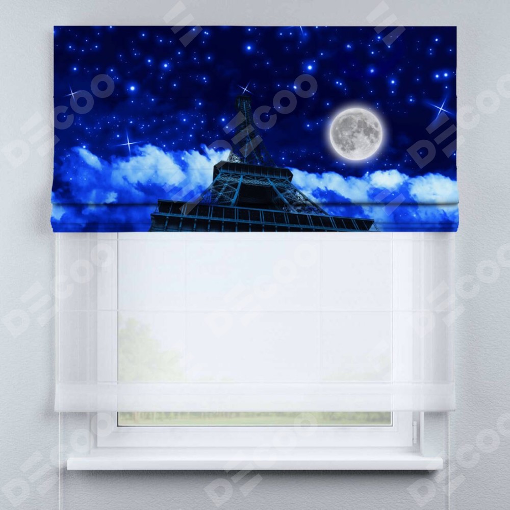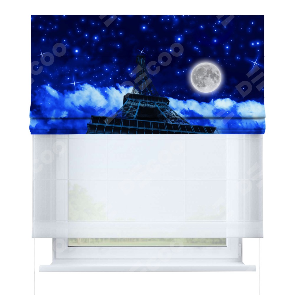 Римская штора день-ночь производителя «Cortin», используется для проёма, пошита из двух полотен, с лицевой блэкаут с нанесением сублимационной печати «Ночь в Париже», вторая ткань тюль (по стандарту комплектуется тюль белого цвета артикул V-01). Имеет универсальный механизм и подходит для монтажа: на потолок, на стену и в нишу.
