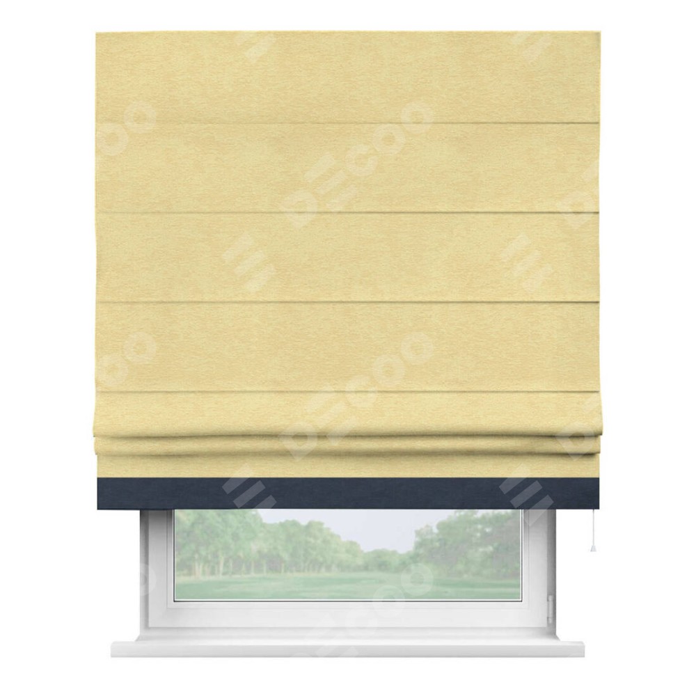 Римская штора производителя «Cortin», используется для проёма, пошита из ткани софт однотонный золотой, артикул 42934. Отделка шторы кантом «Джестер», ткань для канта используется из софта разной расцветки на выбор. Имеет универсальный механизм и подходит для монтажа: на потолок, на стену и в нишу.