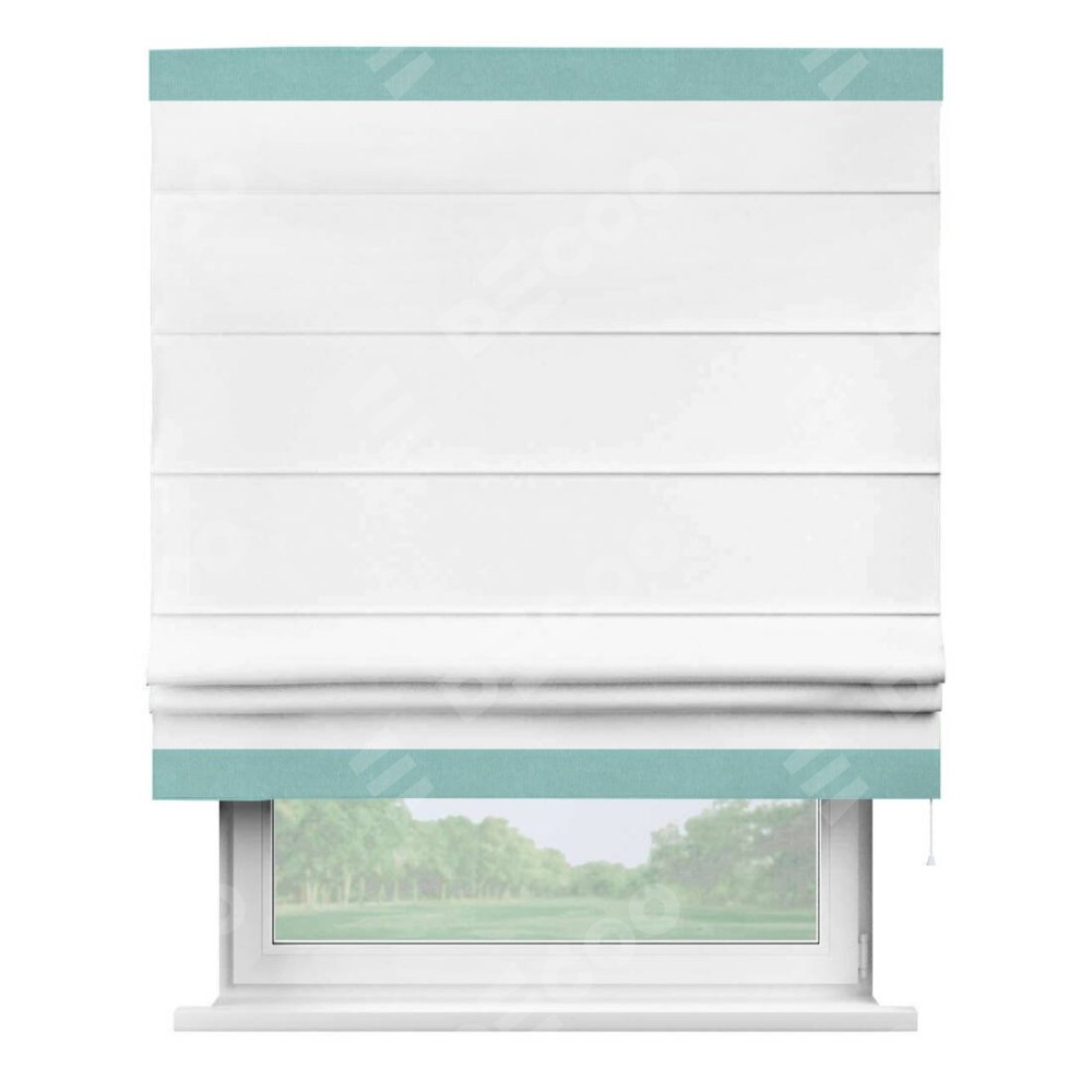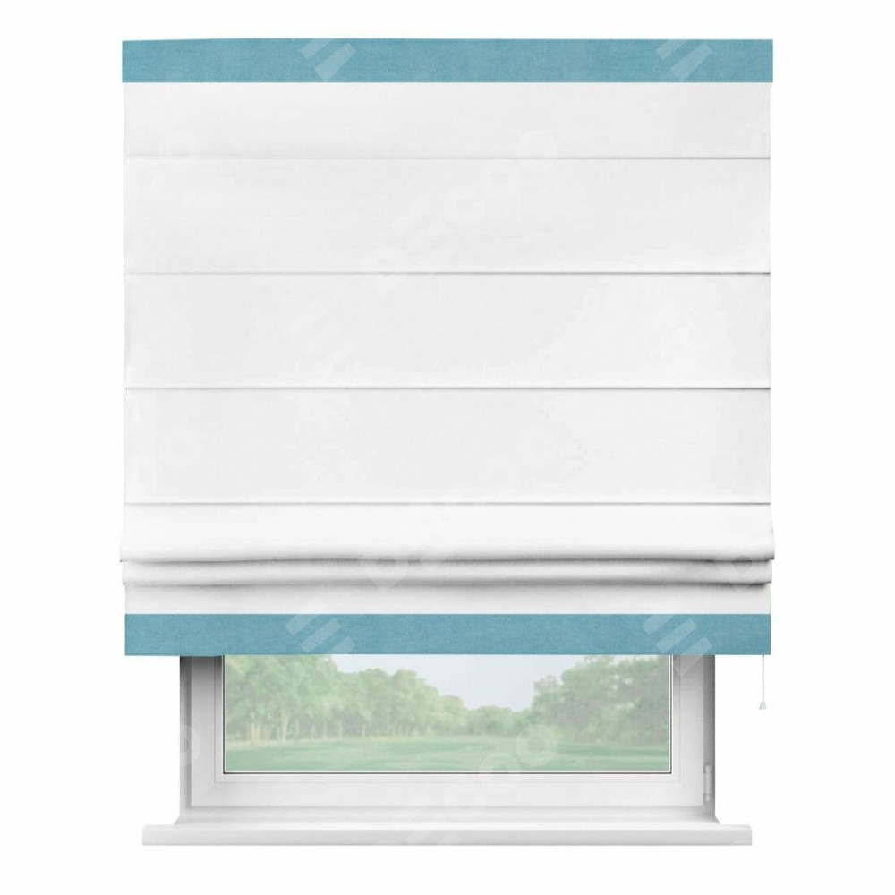 Римская штора производителя «Cortin», используется для проёма, пошита из ткани вельвет белоснежный, артикул ткани 19192. Отделка шторы кантом «Горизонт», ткань для канта используется из вельвета разной расцветки на выбор. Имеет универсальный механизм и подходит для монтажа: на потолок, на стену и в нишу.