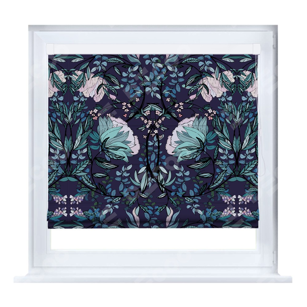 Римская штора кассетного типа, производителя «Cortin», устанавливается только на пластиковые окна и прилегает к стеклопакету, пошита из ткани блэкаут с нанесением сублимационной печати «Цветочный индиго».