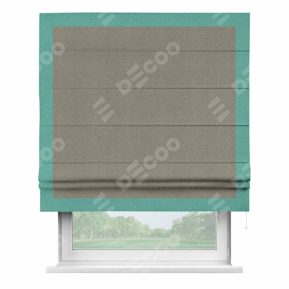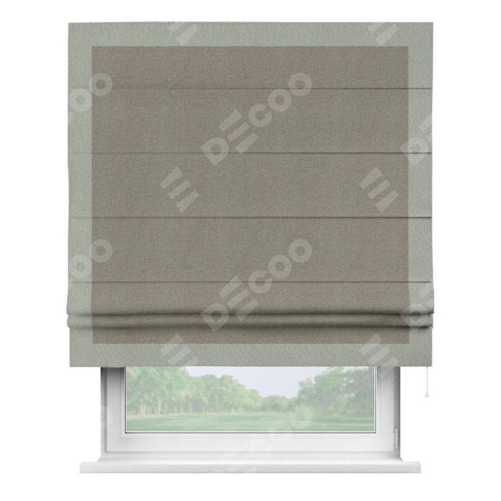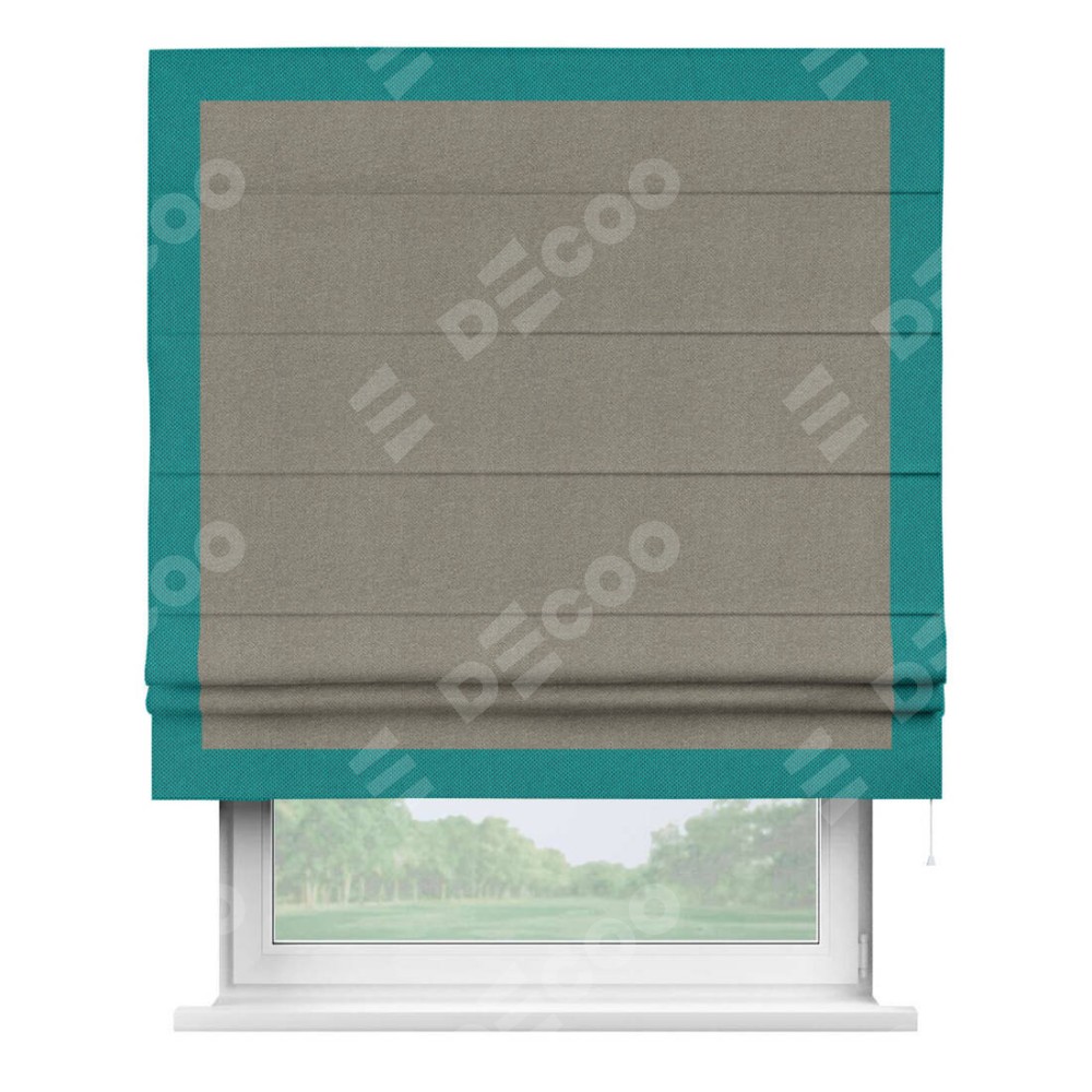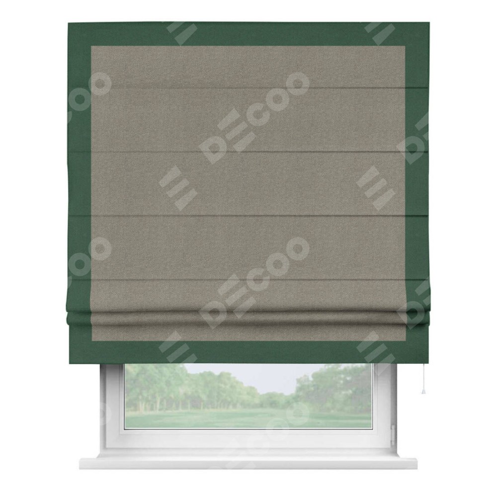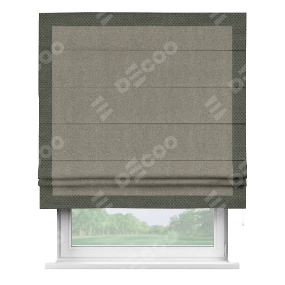 Римская штора производителя «Cortin», используется для проёма, пошита из ткани лён димаут cеро-зелёный, артикул 00003. Отделка шторы кантом «Чесс», ткань для канта используется из льна димаут разной расцветки на выбор. Имеет универсальный механизм и подходит для монтажа: на потолок, на стену и в нишу.