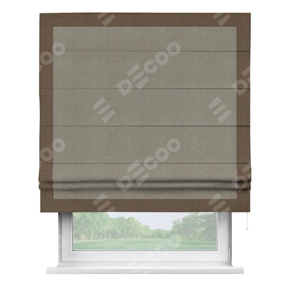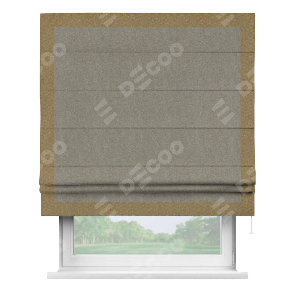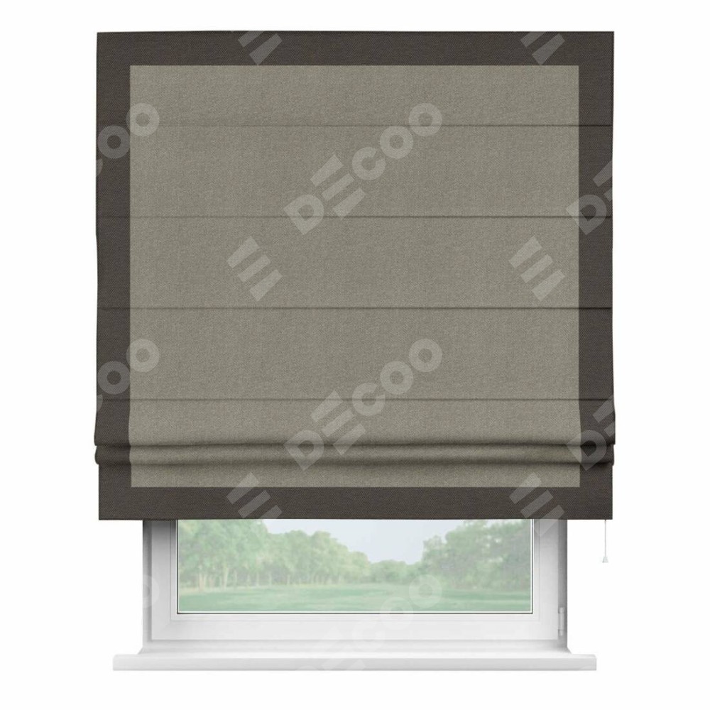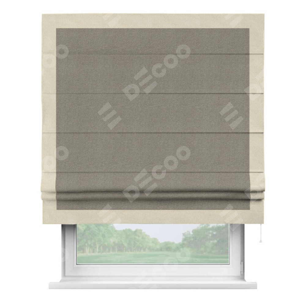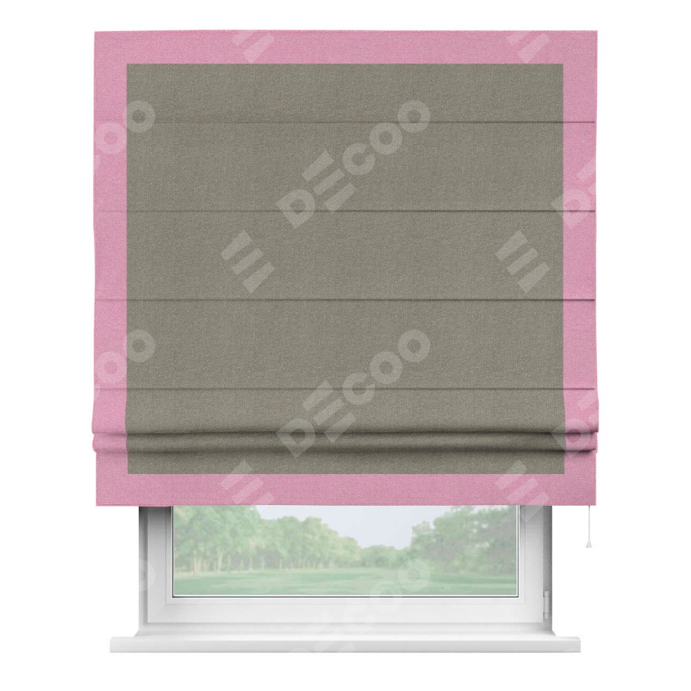 Римская штора производителя «Cortin», используется для проёма, пошита из ткани лён димаут cеро-зелёный, артикул 00003. Отделка шторы кантом «Чесс», ткань для канта используется из льна димаут разной расцветки на выбор. Имеет универсальный механизм и подходит для монтажа: на потолок, на стену и в нишу.