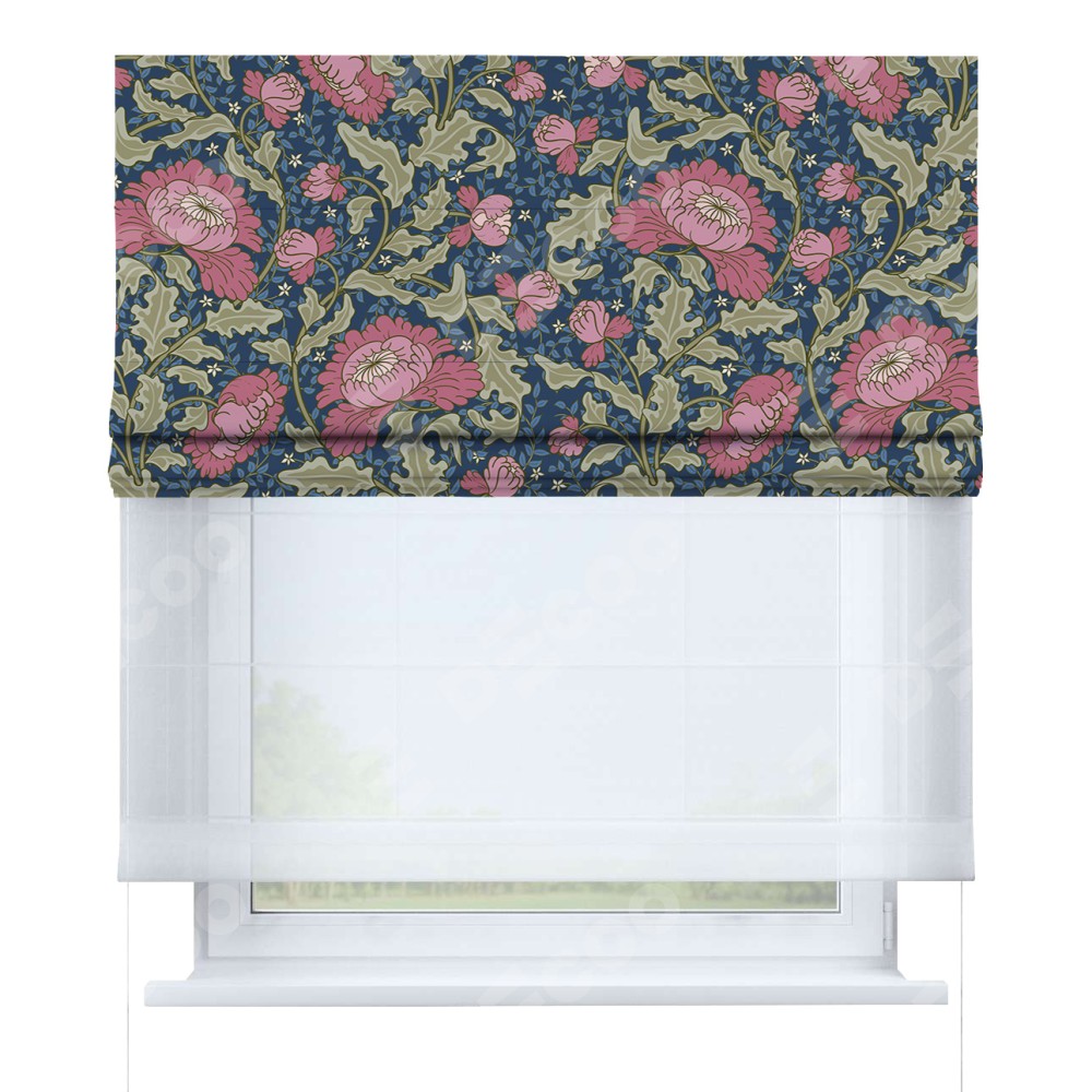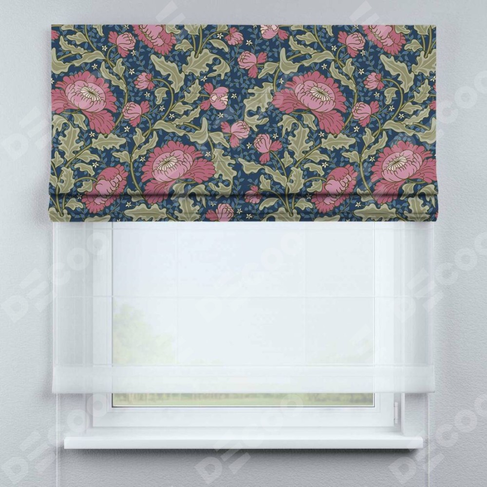 Римская штора день-ночь производителя «Cortin», используется для проёма, пошита из двух полотен, с лицевой блэкаут с нанесением сублимационной печати «Розовые цветы», вторая ткань тюль (по стандарту комплектуется тюль белого цвета артикул V-01). Имеет универсальный механизм и подходит для монтажа: на потолок, на стену и в нишу.