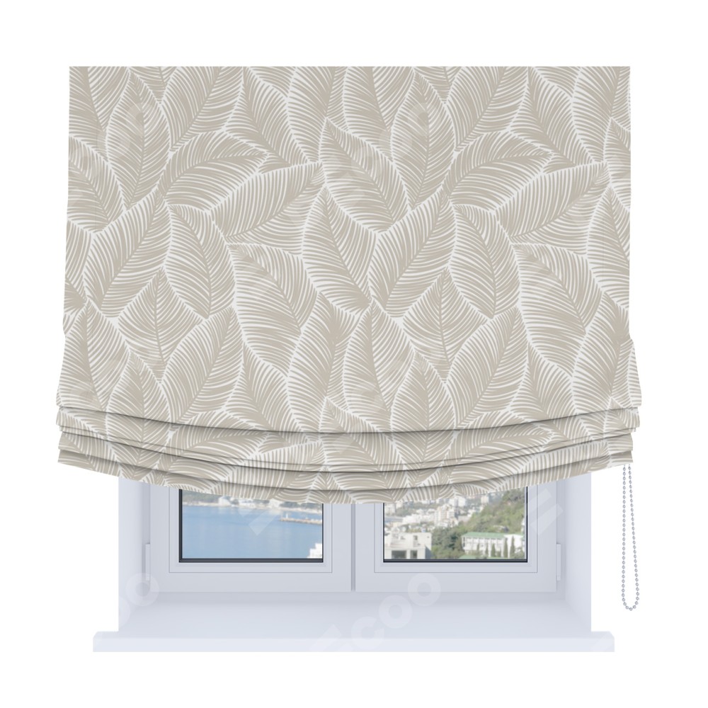 Римская штора Soft производителя «Cortin», используется для проёма, пошита из ткани блэкаут с нанесением сублимационной печати «Бежевые листья». Имеет универсальный механизм и подходит для монтажа: на потолок, на стену и в нишу. В отличие от стандартных римских штор, римская штора Soft не имеет горизонтальных вставок и нижнего отвеса. Это позволяет ткани произвольно драпироваться в свободные мягкие складки.