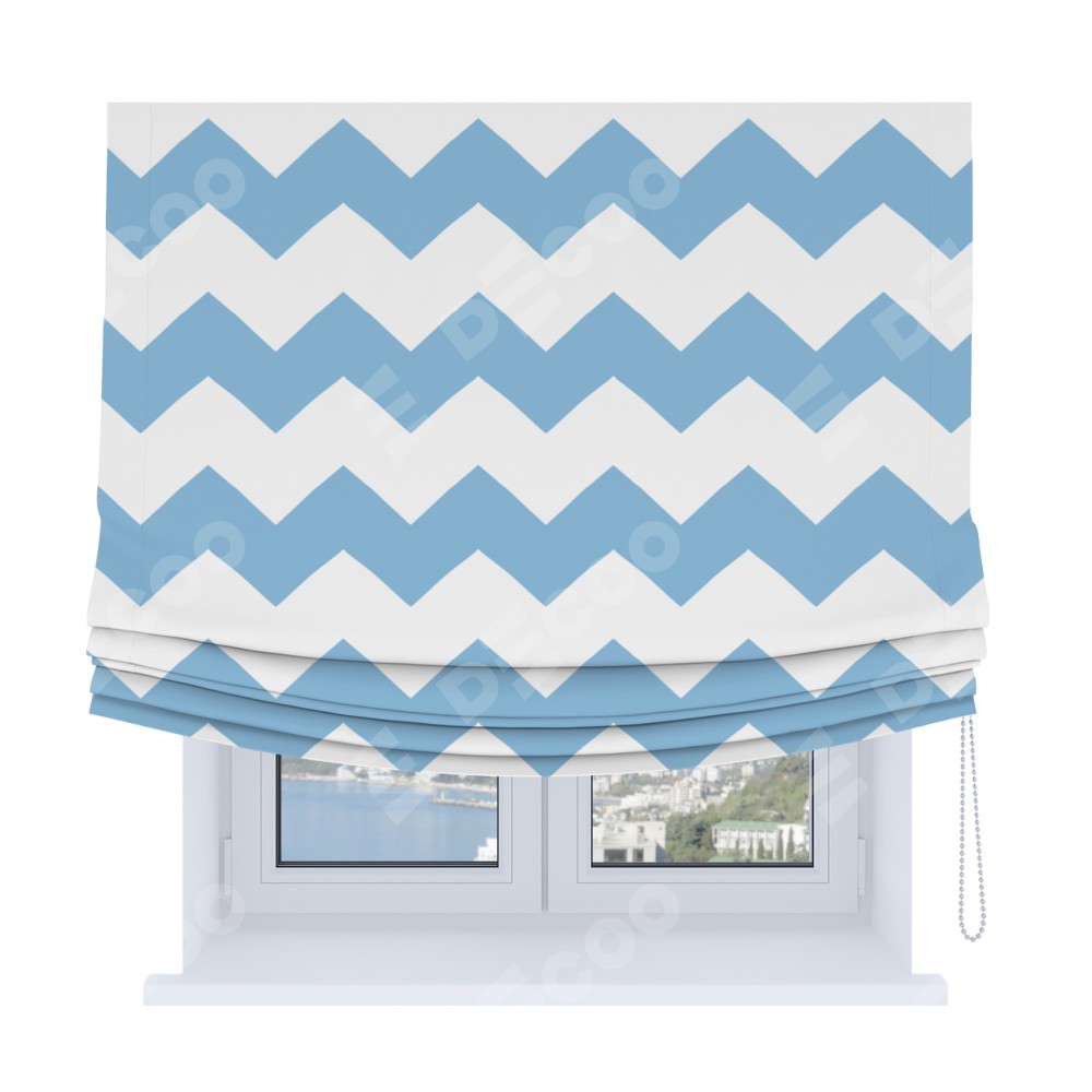 Римская штора Soft производителя «Cortin», используется для проёма, пошита из ткани блэкаут с нанесением сублимационной печати «Зигзаг крупный». Имеет универсальный механизм и подходит для монтажа: на потолок, на стену и в нишу. В отличие от стандартных римских штор, римская штора Soft не имеет горизонтальных вставок и нижнего отвеса. Это позволяет ткани произвольно драпироваться в свободные мягкие складки.