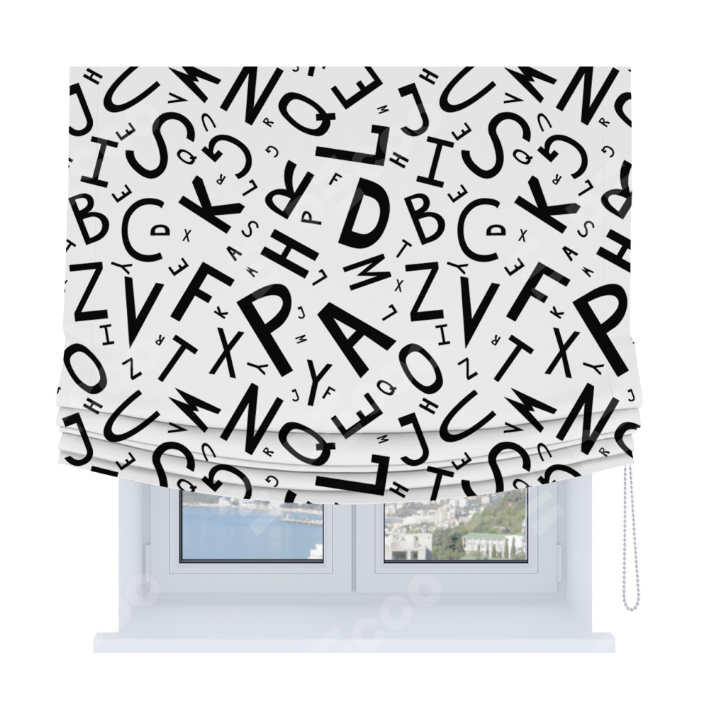 Римская штора Soft производителя «Cortin», используется для проёма, пошита из ткани блэкаут с нанесением сублимационной печати «Литеры на белом». Имеет универсальный механизм и подходит для монтажа: на потолок, на стену и в нишу. В отличие от стандартных римских штор, римская штора Soft не имеет горизонтальных вставок и нижнего отвеса. Это позволяет ткани произвольно драпироваться в свободные мягкие складки.